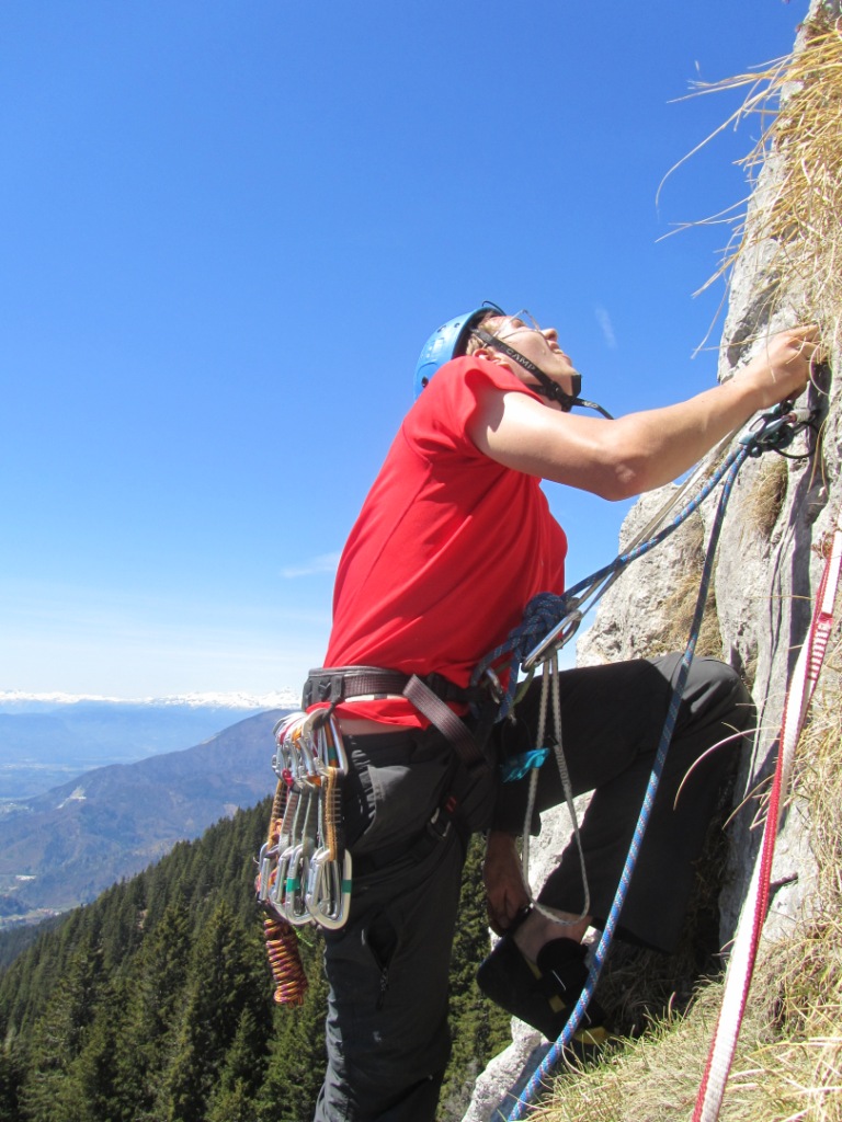 Nekatere smeri v Beli peči so v celoti navrtane s svedrovci in zato ne potrebujemo prav veliko opremo. V večino smeri pa se brez friendov, klinov in zatičev še vedno ne da. Opremljenost smeri je natančno pojasnjena tudi v omenjenem Plezalnem vodničku. Za ogrevanje sva se najprej podala v smer Katastrofula (IV/III), ki poteka po razu v mali vzhodni steni. Splezala sva jo v treh krajših raztežajih. Smer ponuja lepo in ne pretežko plezanje po izpostavljenem razu. Ravno zaradi tega pa je bil razgled s stene na severno steno Storžiča tak kot z razglednice. V zadnjem raztežaju se smer vzpne še čez krajši kamin na travnat vrh.