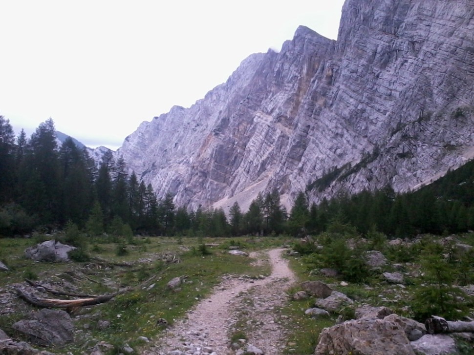 Današnja vremenska napoved je bila še kar ugodna. Skrbelo me je le to da ne bo preveč hladno. Zato sem se na štart v Krmo odpravil šele po deveti uri, v časovnem oknu ko bo najbolj toplo. Že na začetku sem bil presenečen, ker je bilo pri Lesi v Krmi, navkljub pozni uri, parkiranih le nekaj vozil. Gneče torej ne bo. Štart! V prvi ravninski kilometer se zaženem brezkompromisno. Moje ne ogrete noge, pa se še malce obotavljajo. Predvsem pa se jim še pozna predvčerajšnji Tek na Vršič. Potem pa mi steče. V prve položne klance skozi bukov gozd gre skorajda samo od sebe. Pazim le na to da tečem po idealni liniji navzgor po bližnjicah. Večinoma mi je to kar uspelo. Po slabih 20 min teka sem že izven gozda, na tistem mestu kjer se vidi “U” profil Krme. Bližnjic od tu dalje ni več. Tek pa postane precej bolj naporen, saj tu pot prekriva za tek zelo zoprn grušč. Pazljivo stopam z namenom da mi grušč ne bi uničil ritma. Vseeno pa ne pretiravam z napadi, saj se ne želim iztrošiti že čisto na začetku.