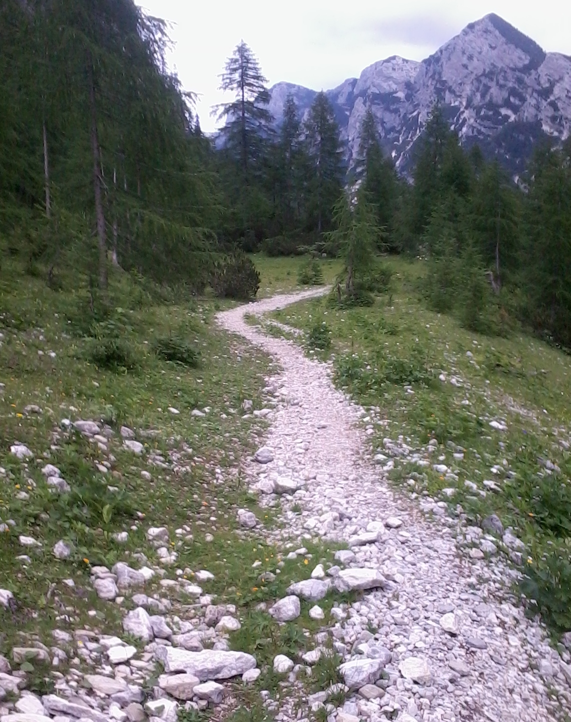 Gruščnatega dela je na srečo hitro konec, pot pa se zravna na prijetni ravnici Vrtača. Tu je pot tako nezahtevna da sem lahko tekel na polno ter si vmes privoščil še prvi požirek pijače. Sledi dokaj naporn vzpon skozi macesnov gozd, ki se konča na veliki uravnavi Malega polja. Dobro minuto časa, ki sem ga potreboval, da sem pretekel Malo polje, sem izkoristil za nekaj globokih vdihov s katerimi sem si znižal srčni utrip. To je bilo nujno potrebno, saj me je na koncu polja čakal vzpon po bližnjici do pastirskega stanu v Zgornji Krmi. Bližnjica pa poteka po precej strmih travah, ki zahtevajo čist drugačen slog teka, kot prej. V tisti minuti sem se v glavi pripravil na to da bodo noge močno pekle, ko bom grizel v strmino. In res so! Nagrada za trud je bil dober vmesni čas pri Prgarci (40 min 10 s). Sledil je krajši ravninski del čez planino, potem pa so noge začele spet peči. Pot čez Kurico mi (tako kot zadnjič) ni uspelo preteči. Niti se nisem trudil, saj je tako strmo da si s hitro hojo le nekaj odstotkov počasnejši kot s tekom, hkrati pa prihraniš veliko moči. Vendar, takoj ko se je pot malce zravnala, sem nadaljeval s tekom. Na Konjskem sedlu sem imel vmesni čas 56 min 30 s – dobre 3 minute hitreje kot zadnjič.