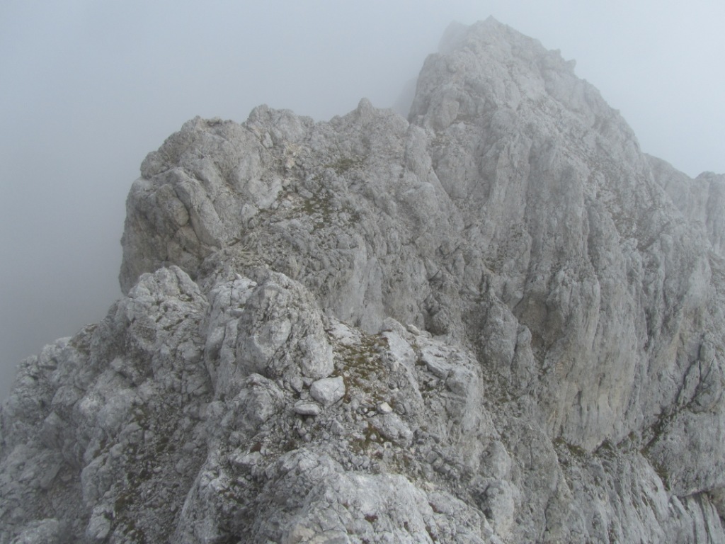Nadaljeval sem po markirani poti prek planine pod Mišelj vrhom proti Mišeljskemu prevalu. Že zelo kmalu pa sem se odcepil na neoznačeno pot v Mišeljsko dolino. Po njej sem nadaljeval do pasu gostega ruševja (možic), kjer sem zavil desno na stezico proti Koštrunovcu. Steza sprva vodi skozi gosto ruševje in po prehodih med skalovjem. Višje pa se je svet nenadoma odpre. Deloma po travah, deloma po robu melišča pod sem se vzpel na manjšo planoto na vzhodni strani Mišelj vrha. Do tu se imel čudovito vreme. Z izjemo številnih čred gamsov pa popolno samoto. S planote se je odprl zanimiv pogledat na Triglav. Namenil sem se še na Koštrunovec da bi naštudiral vzpon na Mišelj vrh. Potem pa se je iz čiste jasnine samo v 15 minutah navalila gosta megla. Odslej sem lahko videl le še max. 50 m pred sabo.