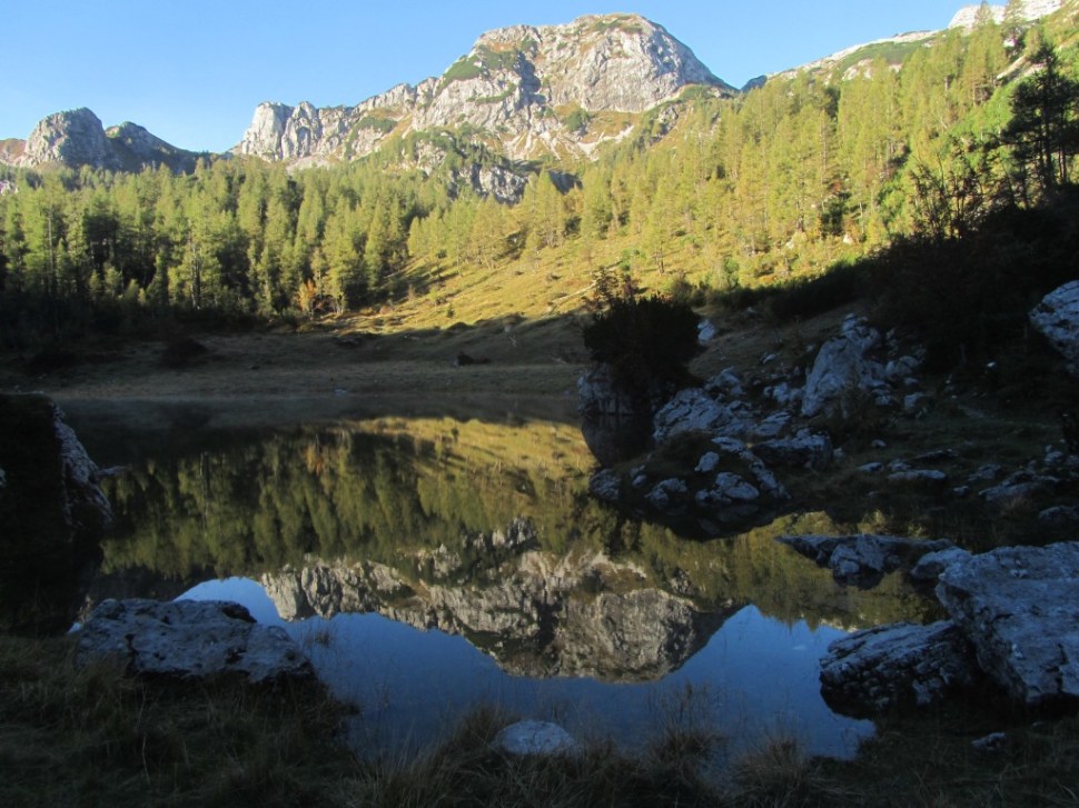 Že pot čez Malo polje je nekaj povsem drugega. Gre za zanimivo zamočvirjeno ravnico, ki jo imamo zaradi njenih značilnosti lahko kar za nekakšno visokogorsko kraško polje. Nastanek polja je še enkrat več povezan s tistim močnim prelomom o katerem sem že večkrat pisal. Na koncu polja se pot nekoliko vzpne in nas pripelje do Presihajočega jezera. Lani sem bil ob istem času tu – pa je bilo popolnoma prazno. Tokrat pa je bilo na srečo polno. Na mirni jezerski gladini pasem lahko videl zrcalni odsev Stogov.