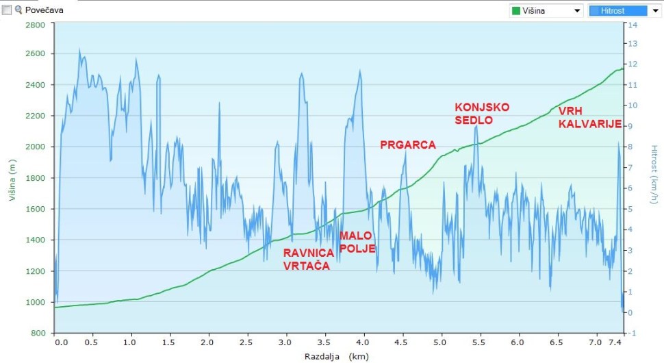 Iz hladu Spodnje Krme sem se izbezal na žgoče sonce grape pod Kurico. Odsek poti pod Kurico je dolg le 400 m, a zelo strm (47 %). Na Konjskem sedlu (1 h 1 min), je sonce začelo še bolj pripekati in me s tem izčrpavati. Za tem je sledila prečnica v desno na vrh Kalvarije. Strmina tega odseka je dovolj zmerna, da sem brez težav ves čas tekel. Le tik pod vrhom Kalvarije je nekaj zajl, kjer se teče nekoliko težje. Sledil je le še finiš, po snegu, do Kredarice. Na cilju sem bil s časom 1 h 27 min 54 s, kar ni najbolje. Pa kdo bi se sekiral ob tako lepem vremenu in razgledih.