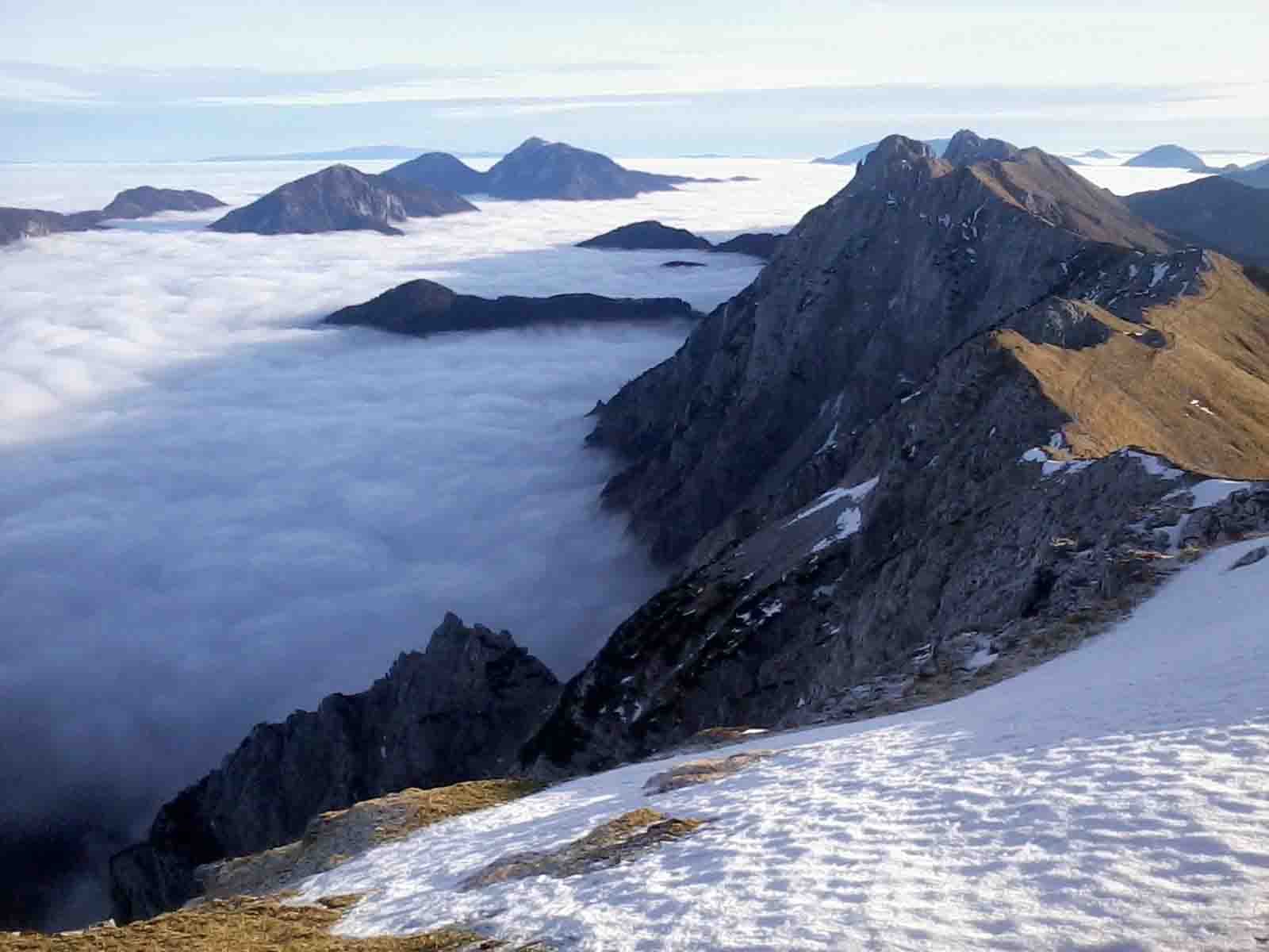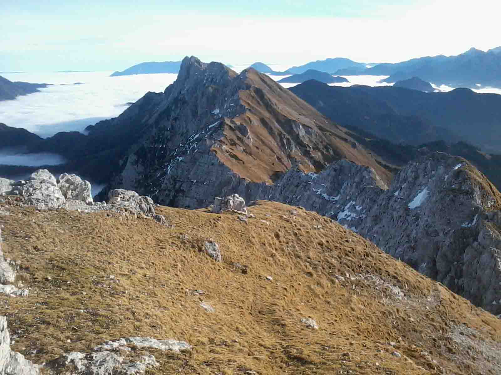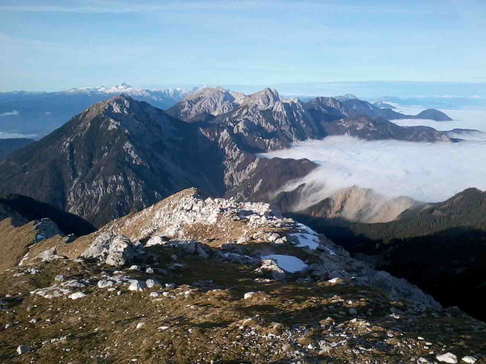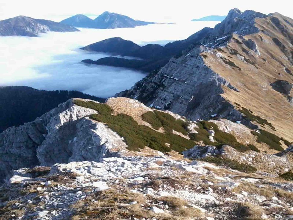 Tako sem z Velikega vrha začel svoj tek na “vzhod”. Že takoj na začetku sem si privoščil krajši ovinek s poti na Toplar, s točno 2000 m najnižji dvatisočak v Sloveniji. Mimo Kofce gore sem nadaljeval proti Malemu Kladivu. Pot je na začetku zelo prijetna in ne zahteva pretirane pazljivosti. Prst na poti je ravno toliko pomrznjen, da prijetno škripa pod mojimi Inov-8kami. Enako velja tudi za spust z Malega Kladiva in vzpon na Veliko Kladivo. Spust z Velikega Kladiva do Škrbine pa je precej dolg (250 višincev) in izpostavljen. Greben se tu toliko zoži da ni prostora za napake.