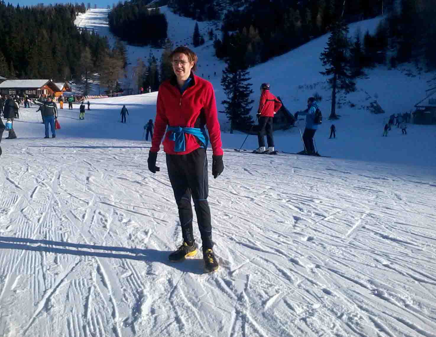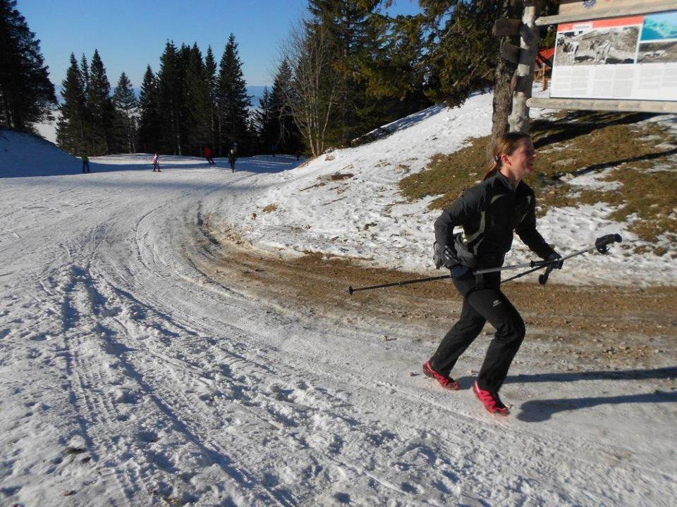 Skorajda vsi so tekli s palicami. Sam pa sem se jim spet izognil. Vendar nisem naredil napake, saj proga ni dovolj strma da bi mi palice koristile. Pot se na dveh mestih sicer postavi po konci, a le za zelo kratek čas. Takoj za tem spet preide v “ravnino”. Res prava ravnina na progi je pravzaprav samo ena – kakšnih 300 m, na srečo, saj sem se tu počutil najšibkejši. Po ca. 25 min teka smo se vzpeli že dovolj visoko da sta se na progi začela pojavljati sneg in led. Drselo je vsem – tudi tistim, ki so imeli palice. Tako smo bili nekaj časa videti bolj baletni plesalci, kot tekači. Vendar se je na srečo vse izšlo brez resnih poškodb.
