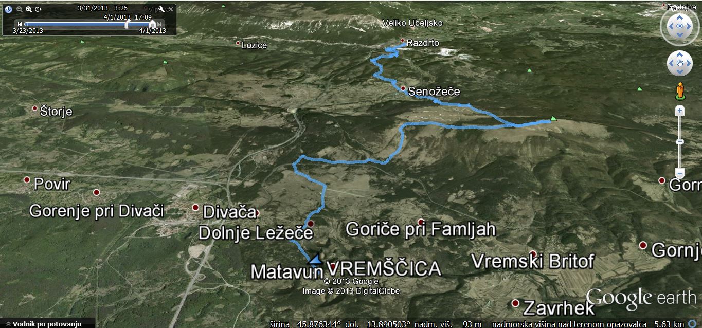 Z vznožja Vremščice je pot dober kilometer vodila vzdolž železniških tirov in pa letališča Divača. En velik desni ovinek je bil to. Potem pa je bilo le še tri kilometre položnega teka skozi macesnov gozd mimo Škocjanskih jam. Z Razdrtega do Škocjana smo potrebovali dobre tri ure. Premagali smo 23,1 km razdalje in pa 950 m vzpona in 1130 m spusta. Lepa trasa, priporočam.