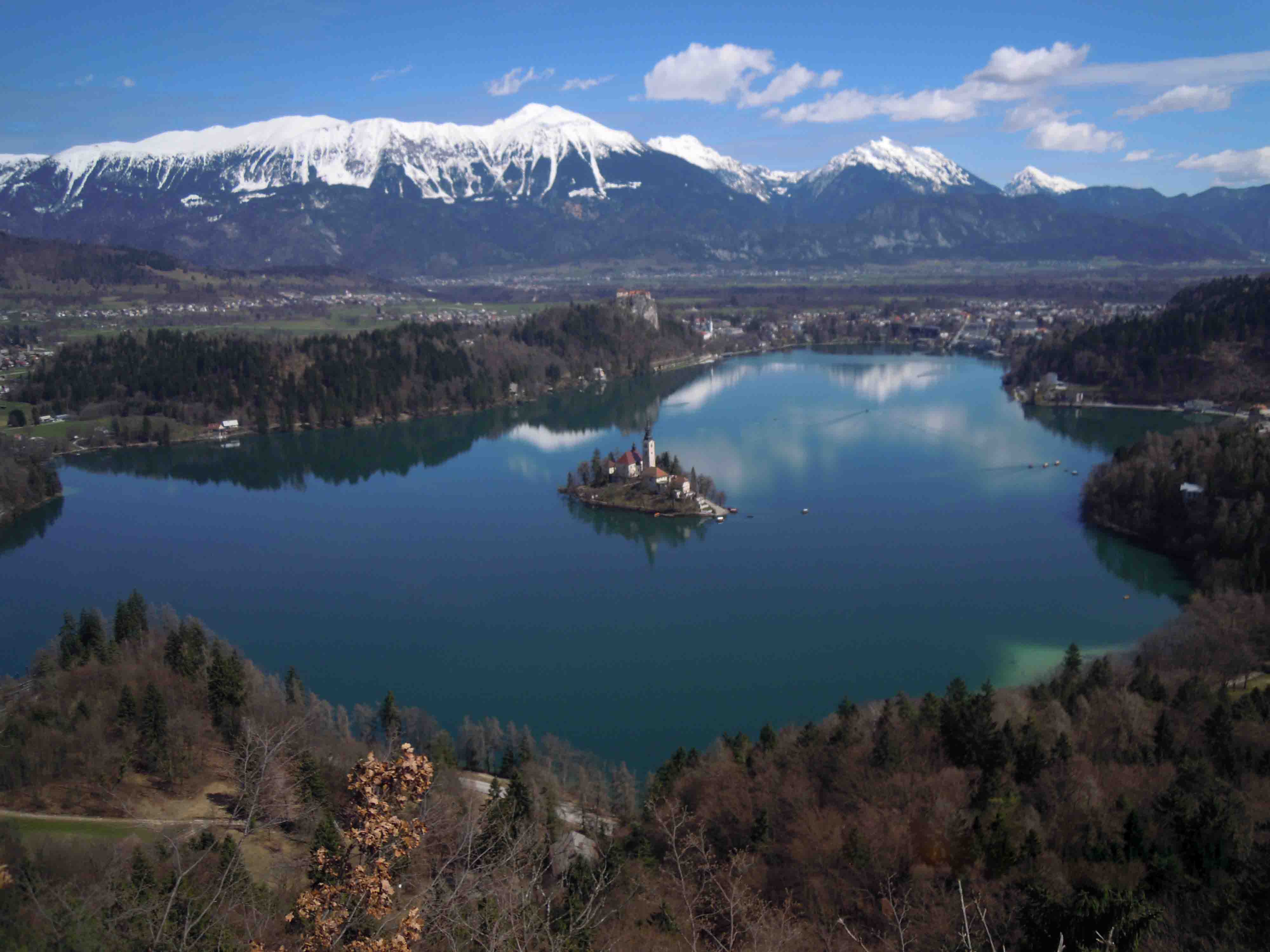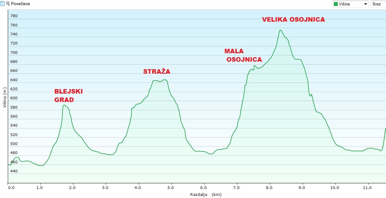 Na razgledni ploščadi na vrhu Male Osojnice pa se odpre najlepši razgled na Blejsko jezero. Tudi če na Osojnici še niste bili, ga poznate, saj s tod fotografirajo za razglednice. Z Male Osojnice sledi krajši spust do razpotja. Tu lahko nadaljujemo naravnost navzdol proti jezeru, lahko pa si privoščimo še krajši ovinek prek vrha Velike Osojnice, ki pa na žalost ni preveč razgleden hrib. Med sestopom z Osojnice pa nikar ne pozabite skreniti s poti proti Ojstrici. To je zelo razgleden vršič, ki se dviga nad avtokampom Bled. Pot oz. razrit kolovoz nas nazadnje pripelje nazaj do obale jezera v bližini mesta, kjer se začnejo podesti. Po podestih oz. po cesti nadaljujemo do kopališča v zalivu Velika Zaka. Že tu si lahko namočimo noge v vodo. Lahko pa nadaljujemo še slab kilometer mimo vesalških tribun do Male Zake. Pot po kucljih okrog Blejskega jezera je dolga slabih 12 km in premaga skupno 650 m višinske razlike. Za primerjavo – najkrajša pot ob obali Blejskega jezera je dolga 5,73 km. Juretu je bil že ta krog dovolj in je zavil v cilj, sam pa sem za tem odtekel še en krog ob obali. Dober spomladanski trening je bil to.