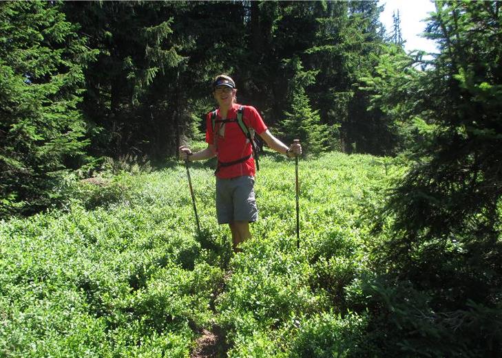 Vročina je postala neznosna. Ves čas sem se silil piti. Tukaj pa je bila poraba vode neverjetna. Dejansko sem sesal vodo iz kamele povprečno enkrat na tri minute! Na tem odseku sem porabil skorajda dva litra vode za tri ure hoje. Pravzaprav nisem pil vode, ampak razredčen izotonik. Sicer pa so poti na Smrekovcu res lepe in takšne kot bi si jih človek samo želel. Ves čas se hodi v rahlih vzponih in spustih po mehki potki med gostim borovničevjem. Nikjer ni toliko borovničevja, kot na Smrekovcu. Razlog je zato, ker ga sestavljajo vulkanske andezitne predornine. Torej sam Smrekovec nikoli ni bil vulkan, le kamnine, ki ga sestavljajo so vulkanskega izvora. Stare pa so okoli 30 milijonov let. Borovnice pa ljubijo kisle vulkanske kamnine. Zato jih je tod toliko. Nekaj borovnic smo mimogrede tudi poskusili.