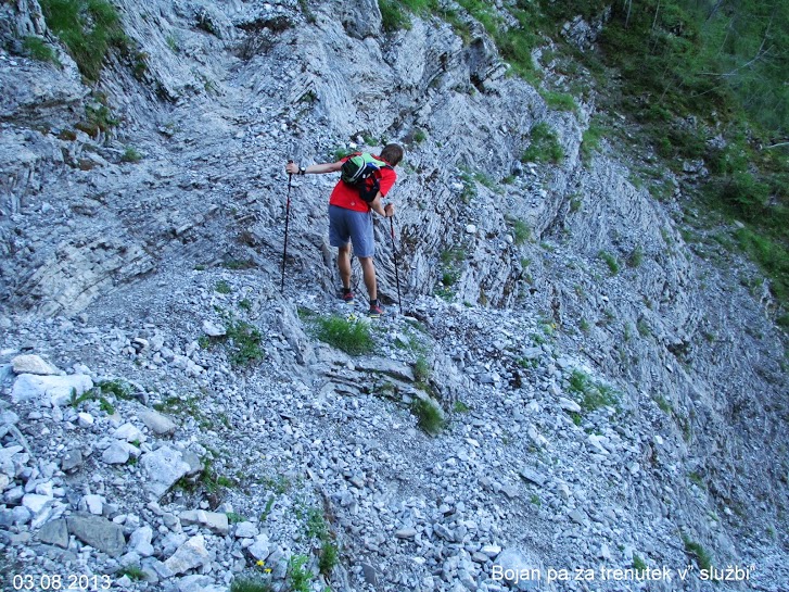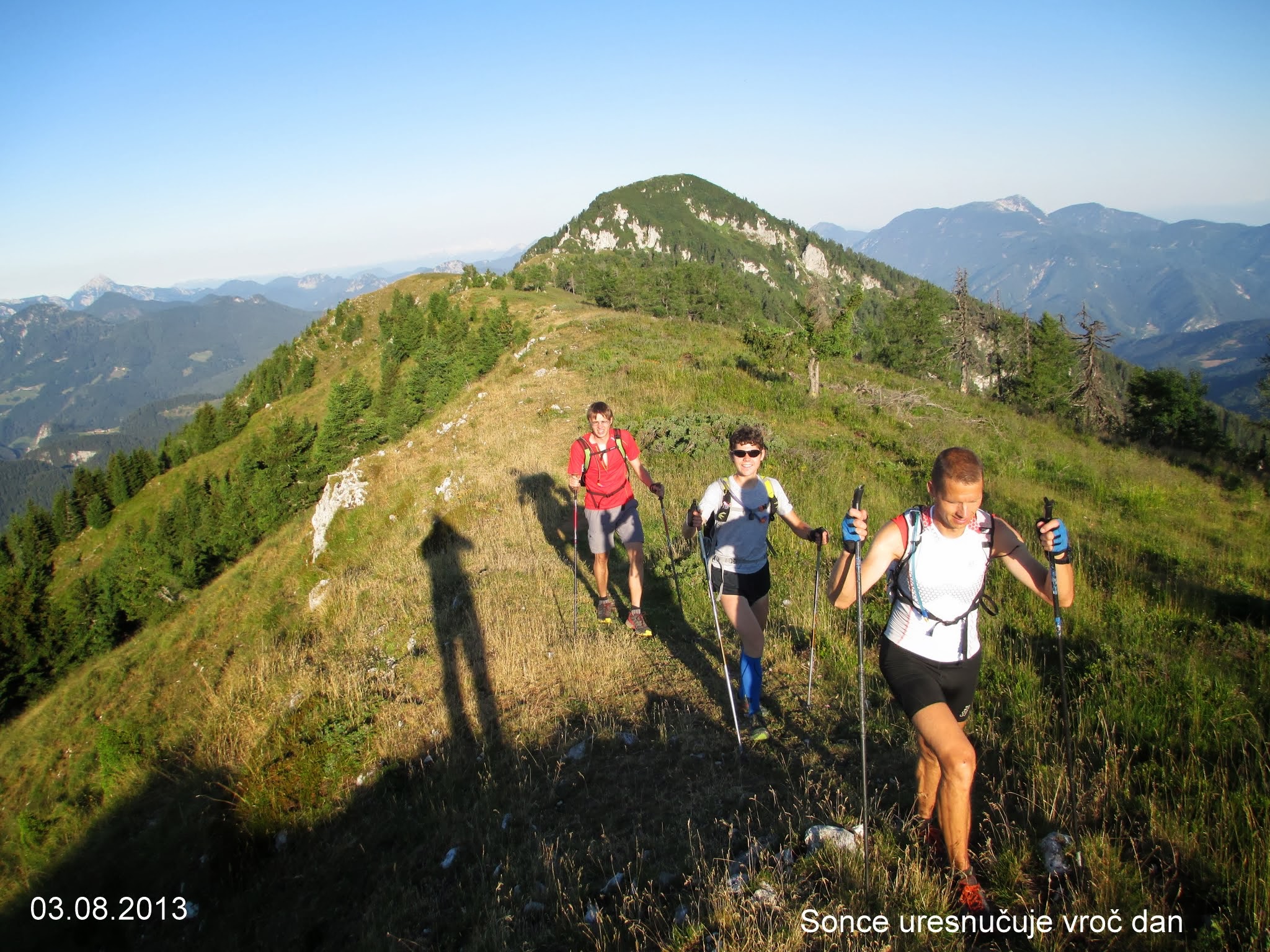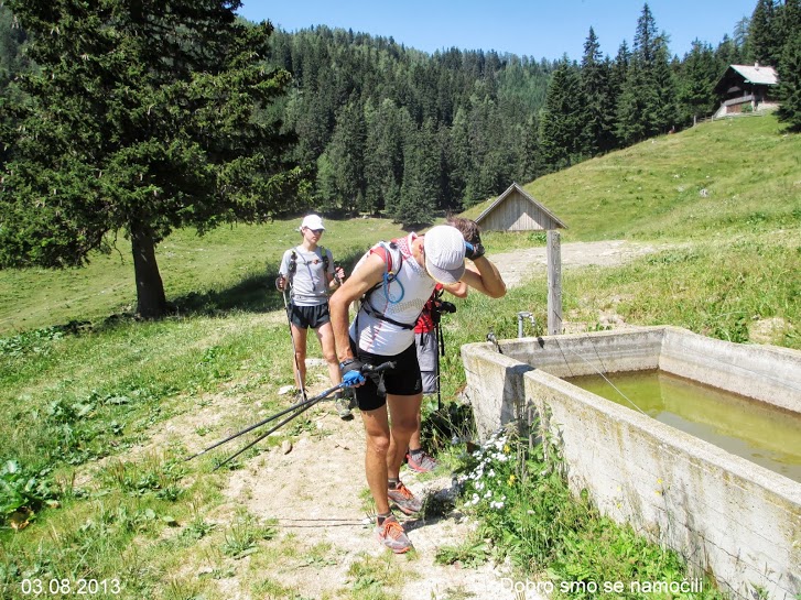 Spust z Olševe je bil zelo strm. Sam sem ga premagal zelo previdno, saj so bile moje noge še neogrete in nisem hotel izzivati poškodb. Klemenu in Luki pa so se cedile sline, saj imata rada take strmine. Po cesti nad našo najvišjo kmetijo Bukovnik smo nadaljevali proti Koči na Grohatu, kjer je bil po desetih urah hoje naš prvi postanek. Na debelo smo si natočili tudi naše kamele, saj se sedaj počasi začenja tudi naš drugi boj – ne več samo s potjo, ampak tudi z vročino. V Sloveniji so na ta dan povsod padli vročinski temperaturni rekordi, tudi po kočah, kjer smo hodili še nikoli niso v tako ranem jutru zabeležili takšnih temperatur.