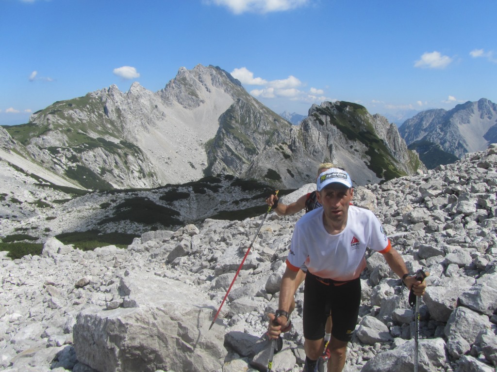 Na Robleku smo se ustavili le toliko da smo napolnili zaloge vode, potem pa takoj proti vrhu Begunjščice. Če se mi je do sem zdel tempo počasen, je Marjan proti vrhu Begunjščice močno potegnil. Z Robleka na vrh Begunjščice smo potrebovali samo pol ure. Potem pa je sledil adrenalinski spust po meliščih Šentanskega plazu. Šentanski plaz sem pozimi že mnogokrat prehodil, poleti pa še nikdar. Vendar so bile skrbi odveč, saj je melišče zelo dobro. Le na koncu spusta na Zelenici, mi je šlo skorajda na jok, ko sem pogledal podplate svojih copatov za gorski tek. Melišča so ekonomična le s časovnega vidika. Med tem je Marjan po zgolj dveh dneh že uničil en par copat. Za sam podvig ima pripravljenih kar pet parov copat.