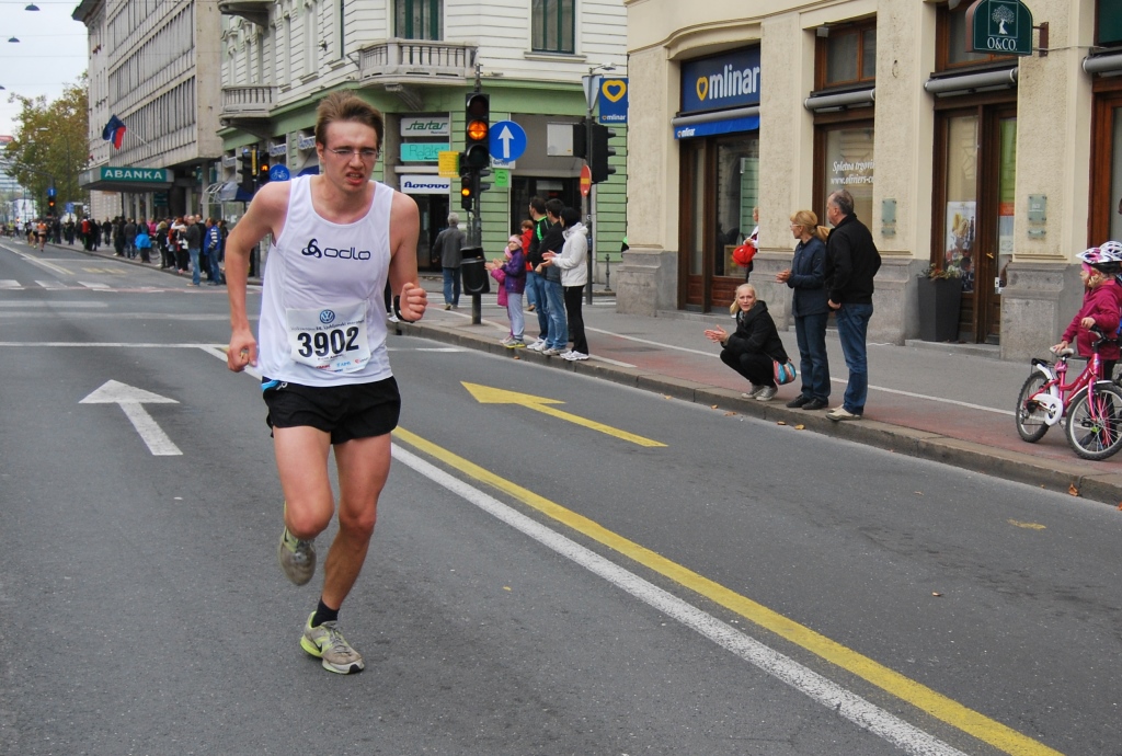 Vremenska napoved je bila prava. V zadnjih 5 kilometrih je začel pihati močan veter in to naravnost v prsa. To se je gotovo pri vseh poznalo na končnem rezultatu. Poleg tega pa mi je ušla skupina in sem moral sam rezati zrak. Zaradi listja, ki ga je nosil vrtinčast veter, je nastalo pravo jesensko vzdušje. Dunajska cesta se je vlekla v nedogled. V zadnjem kilometru po Slovenski cesti sem iz nog iztiskal vse tisto kar je še ostalo. Žal pa mi kljub vsemu ni uspel tek pod 1 h in 20 min. Če pa že meni ni šlo, pa sem toliko raje stisnil čestitke, vsem tistim, ki so danes odtekli izjemno. Zmaga v polmaratonu je odšla v roke Mitji Krevsu, ki je pred tednom dni kot edini Slovenec po dolgih letih pretekel 10 km pod 30 minutami. Sledila pa sta mu Italijan Bernardi in Rok Puhar. Čestitke pa si zasluži tudi tekaški kolega Anže Božič, ki je s tem pod 1 h in 15 min zaključil deseterico najboljših.