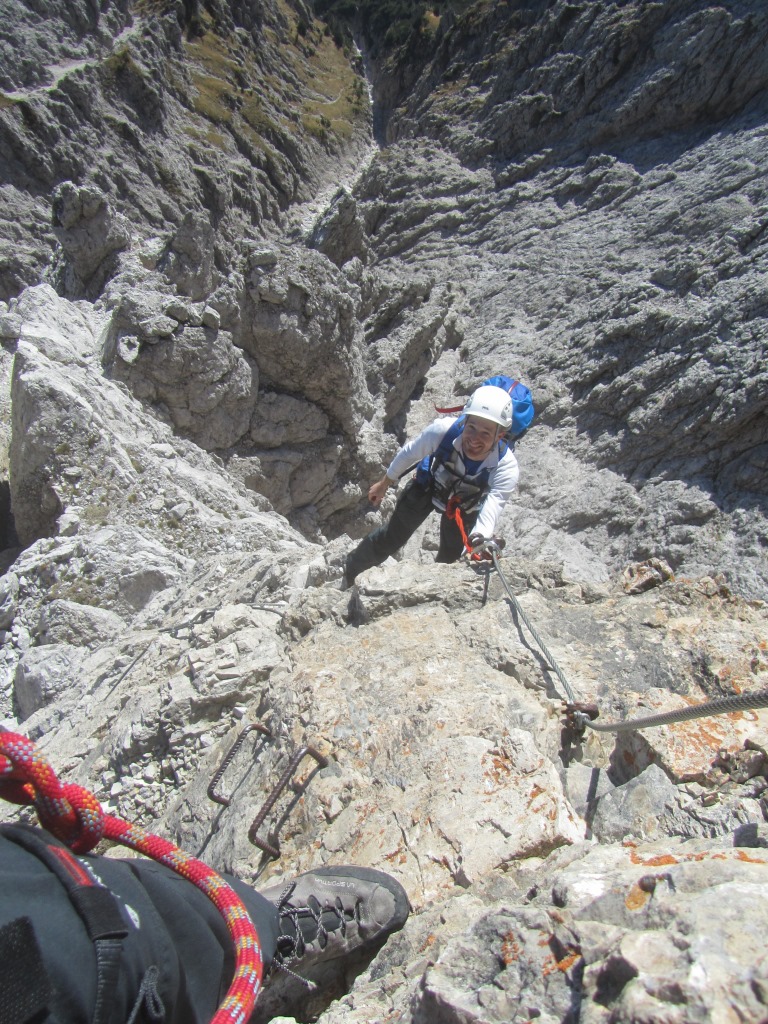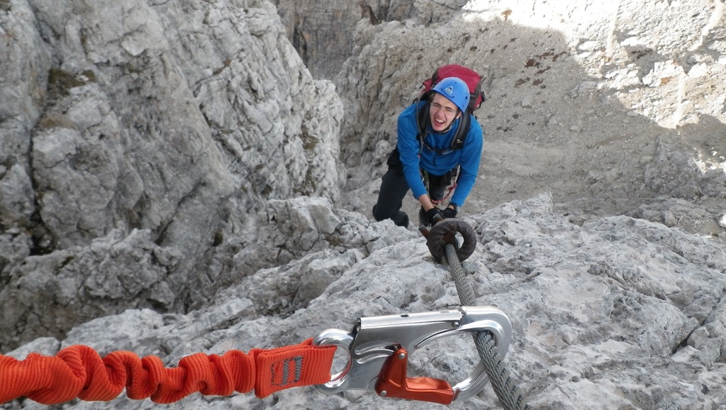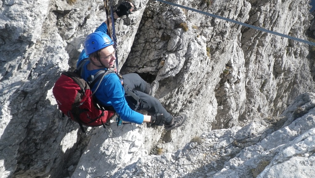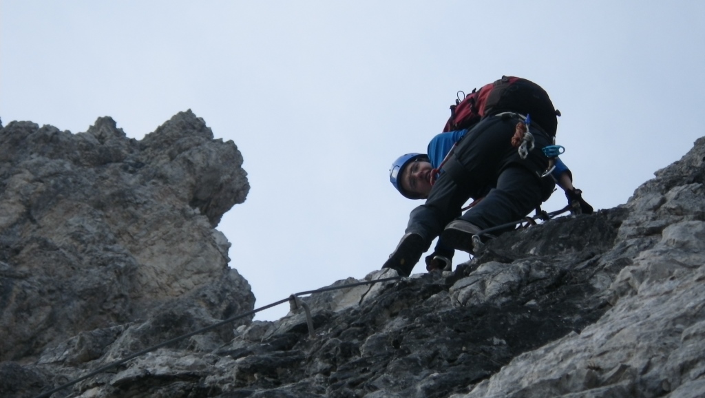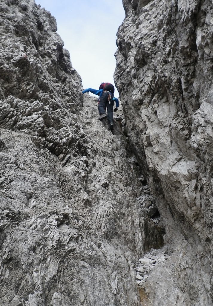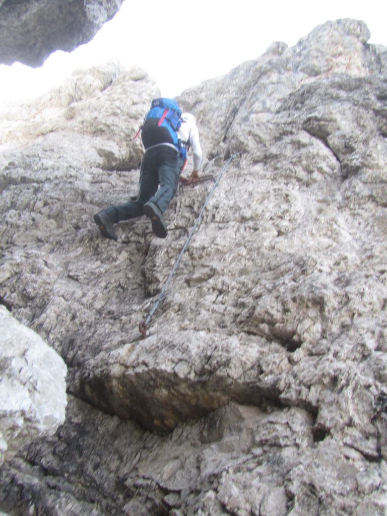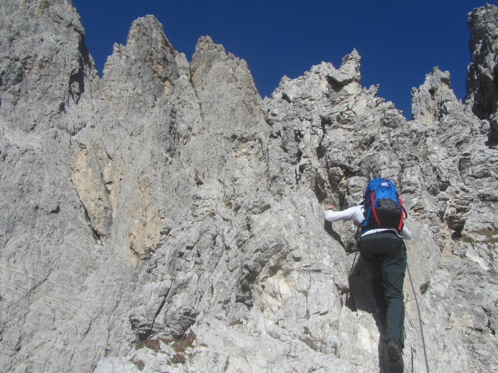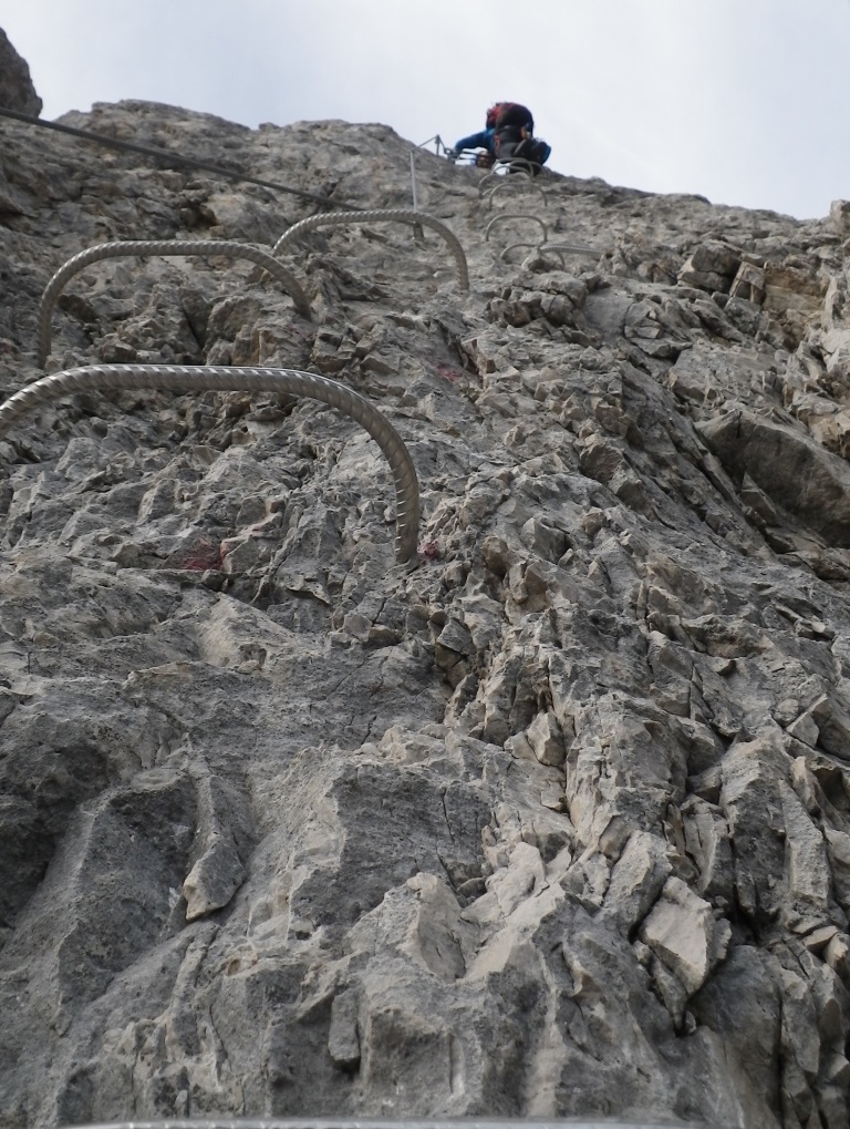 Začetek ferate je izpostavljen in je potrebno samovarovanje. Potem pa vsaj za kakšno uro hoda ne srečamo več omembe vrednih jeklenic. Pot se vzpenja ves čas navzgor po široki grapi, ki jo objemajo skalni stolpi. Počasi sem se že začel spraševati, če so če so pisci poti pretiravali da gre za zahtevno ferato. Pot za tem z grape zavije na krajši greben, ki pripelje na škrbino. Tu pa se prava ferata pravzaprav začne. Vzpon iz škrbine je strm in mestoma zelo izpostavljen. Potem pa poči začne prečiti proti desni po ožjih sklanih policah. Na enem mestu pot preči globoko luknjo v steni in ravno tu jeklenica manjka. Za take primere v nahrbtniku ni odveč kakšen prusik.