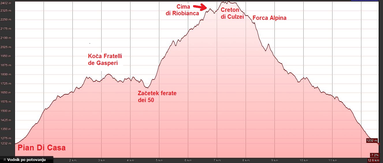 Nazadnje pot le pripelje na greben gore. Mislila sva da je tu že konec ferate. Pa je od tu do vrha Cretona di Culzei še dolg greben. Ferata se sedaj vzpenja in spušča v številne škrbine. Ponekod je spet zelo izpostavljeno, a so varovala dobra, skobam pa se na tej ferati tudi še niso odrekli. Posebnost ferate so tudi posebni jekleni “ročaji” za katere se lahko oprimemo. Podobne umetne oprimke najdemo tudi pri denimo na poti čez Prag, a jih seveda ni toliko kot tu. Celotna ferata je markirana za 6 ur hoje.
