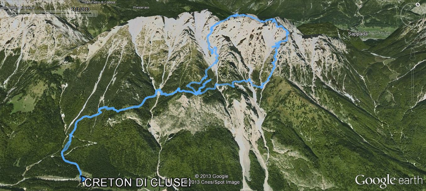 Na koncu se ferata spusti v široko škrbino Forca Alpina. Tu sva naletela na sve poti. Leva je zavila navdol proti koči de Gasperi. Naravnost pa je zavila na videz neka nova ferata proti vrhu gore Creton di Clap Grande. Odločila sva se da stopiva na to ferato. Vendar se je že po nekaj metrih izkazalo da ferata ne pelje na vrh gore, ampak vrtoglavo navzdol prek zelo strme stene.