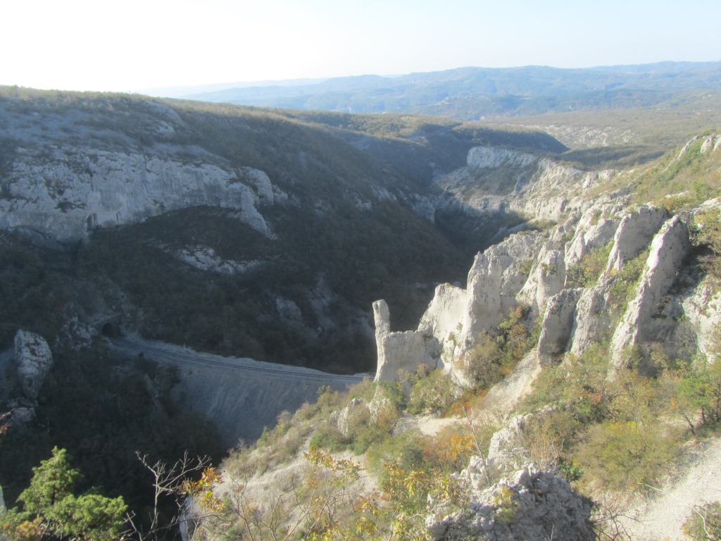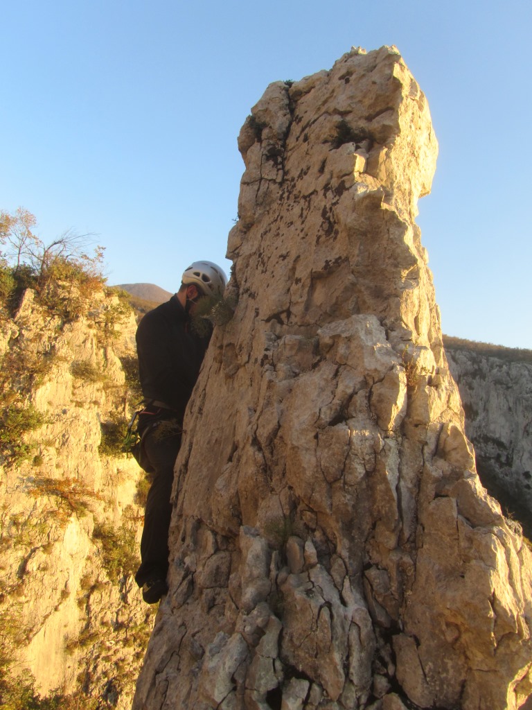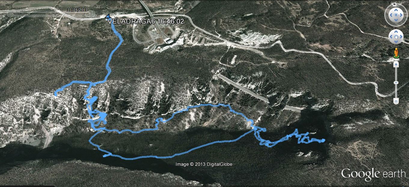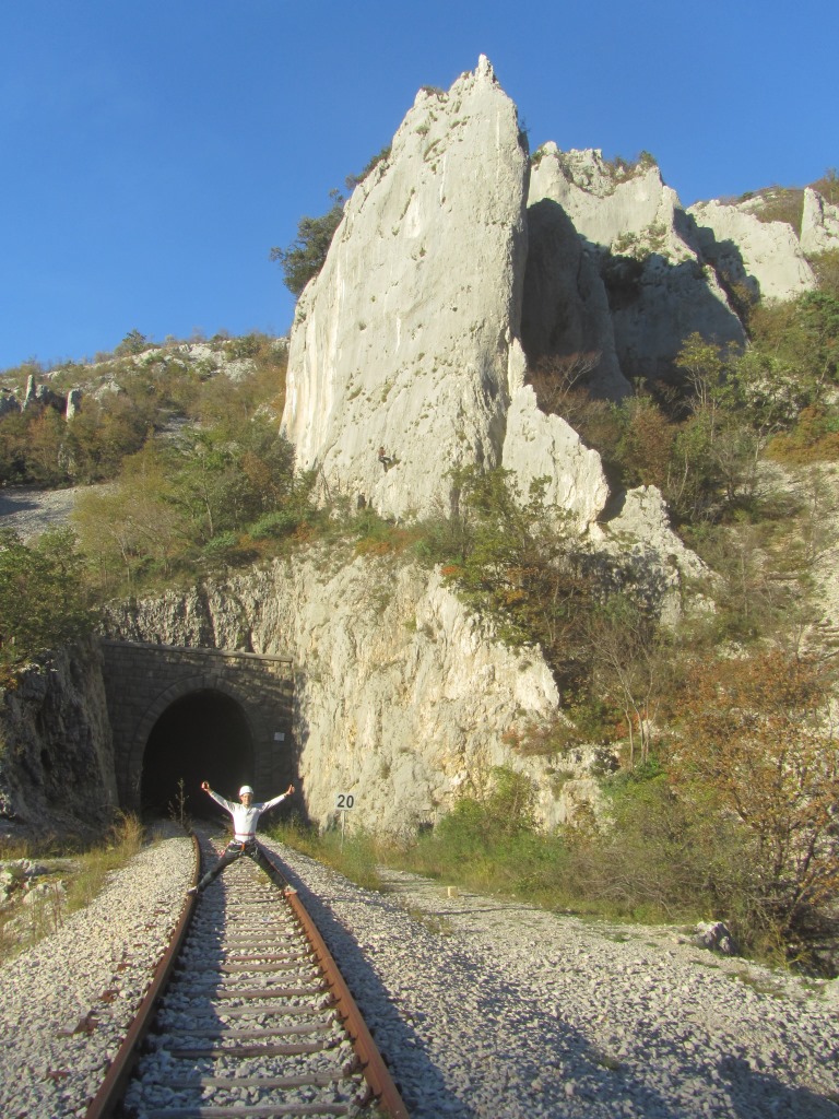 Sama dolina je dovolj zanimiva že sama po sebi. A, v prvi vrsti je to plezalski raj. Ker sva bila oba prvič tukaj, se nisva znašla najbolje. Skica doline in plezalnih sektorjev naju je popolnoma zmedla. Dolina je namreč dolga okoli 2 kilometra. Na dvoje pa jo na jugu deli železniška proga, ki služi kot dobra orientacijska točka. Midva sva za začetek splezati skalni stolp Veliki toranj, ki se nahaja v sektorju K. Glede na skico pa je bil ta stolp videti nekje na koncu doline. In tako se je začela najina dolga odisejada skozi goščavo in melišča. Še sedaj se smejem ko gledam GPS sled kje vse sva lezla. Po totalnem brezpotju, kjer sva tu in tam morala zares plezati, sva begala več kot eno uro hoje proti zatrepu doline. Šele ko sva prišla v sam kanjon Vele Drage (kjer je celo slap) in po njem zlezla pod avtocestni tunel Učka, sva ugotovila da verjetno z zemljevidom ni vse v redu. Če ne drugega sva gorska-tekača imela spet svojo dozo treninga, saj sva oba tovorila zelo težke nahrbtnike.