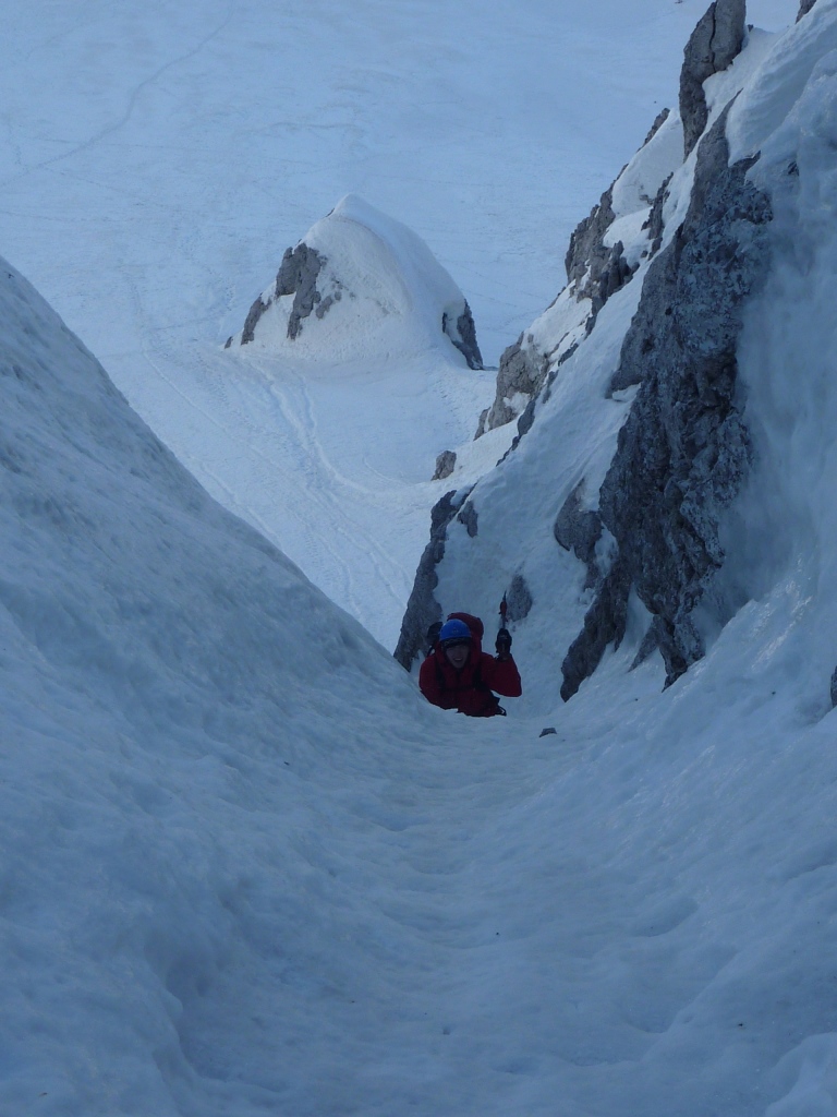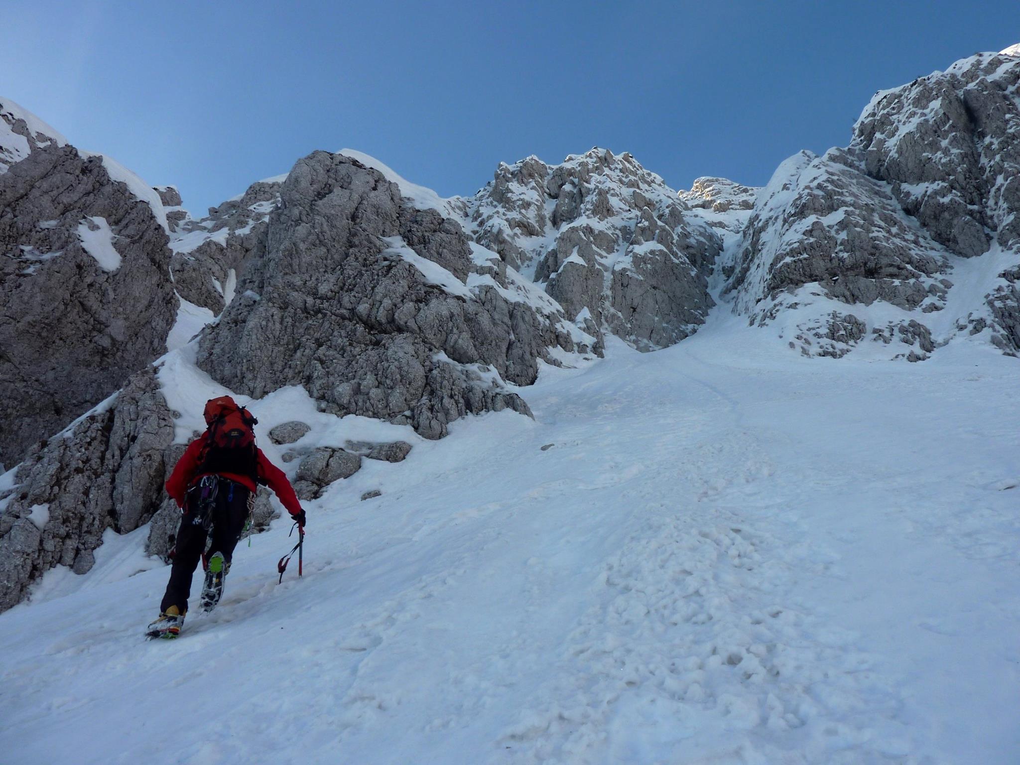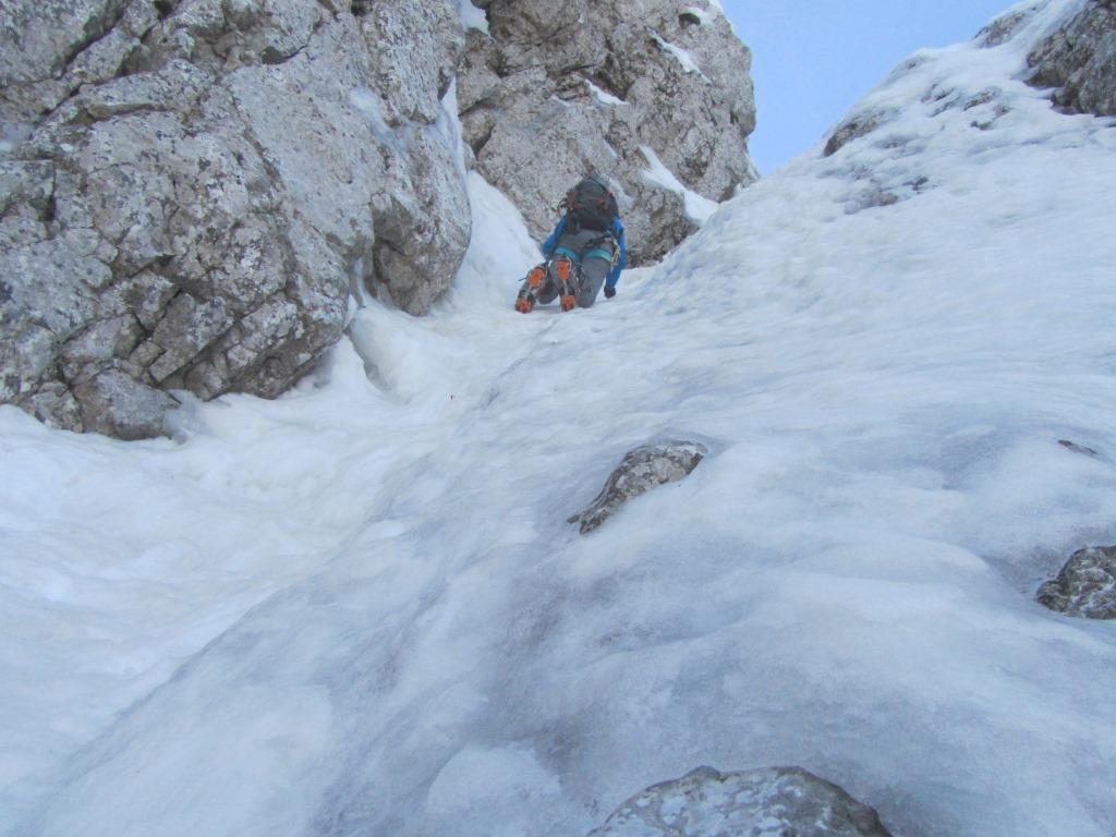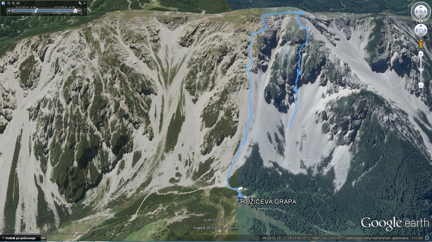 Na Kočo na Zelenici pa zavijeva v Rožičeva grapo, ki je od vseh smeri še najbolj v senci. Zeleniška smer pa se že koplje v sončnih žarkih. Vstop v Rožičevo grapo je položen. Potem pa hitro prideva do najtežjega in najbolj strmega dela. Na srečo je sneg oz. led odličen. Cepini in dereze prijemajo kot v ledeniškem ledu. Zato nadaljujeva nenavezana. Po kakšnih 50 višincih se strmina unese, grapa pa močno razširi.