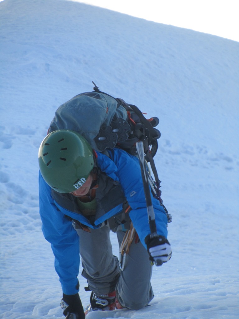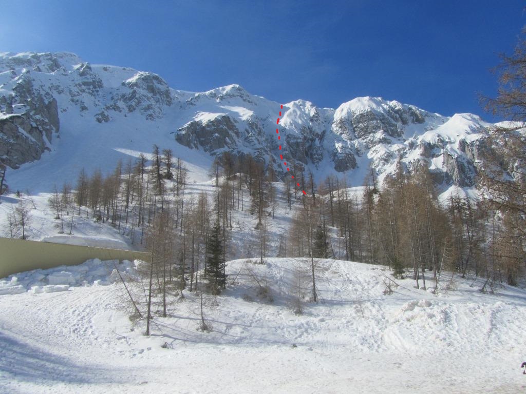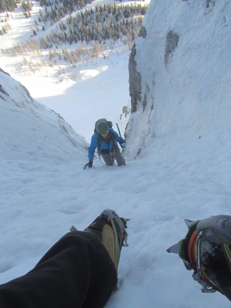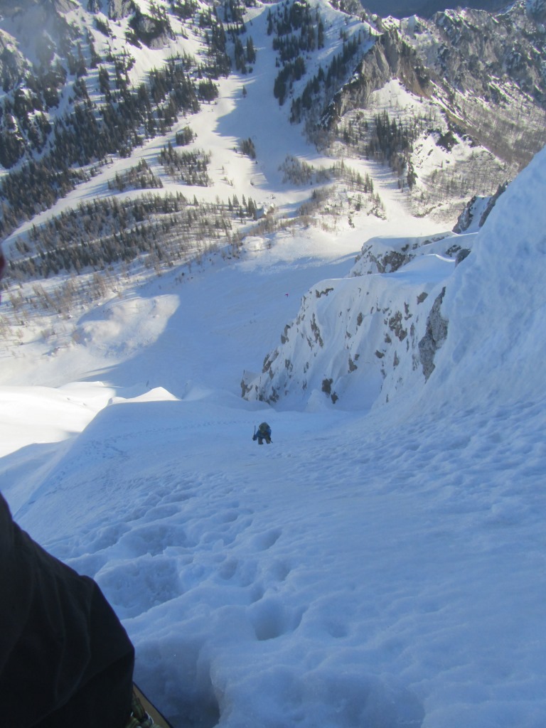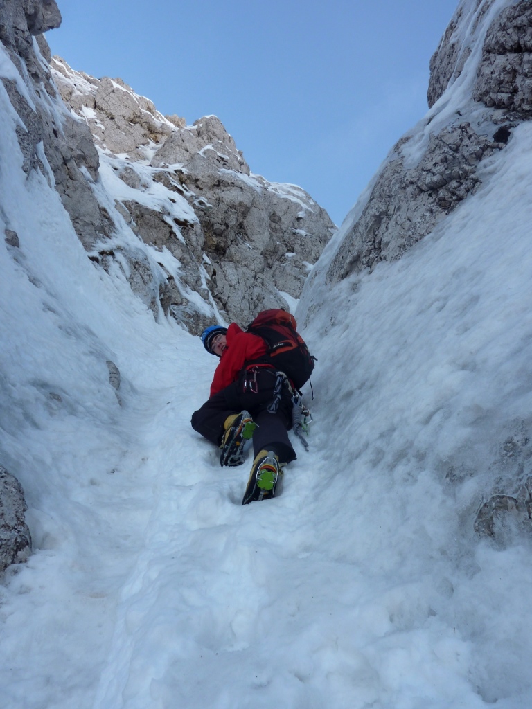 Na Kočo na Zelenici pa zavijeva v Rožičeva grapo, ki je od vseh smeri še najbolj v senci. Zeleniška smer pa se že koplje v sončnih žarkih. Vstop v Rožičevo grapo je položen. Potem pa hitro prideva do najtežjega in najbolj strmega dela. Na srečo je sneg oz. led odličen. Cepini in dereze prijemajo kot v ledeniškem ledu. Zato nadaljujeva nenavezana. Po kakšnih 50 višincih se strmina unese, grapa pa močno razširi.