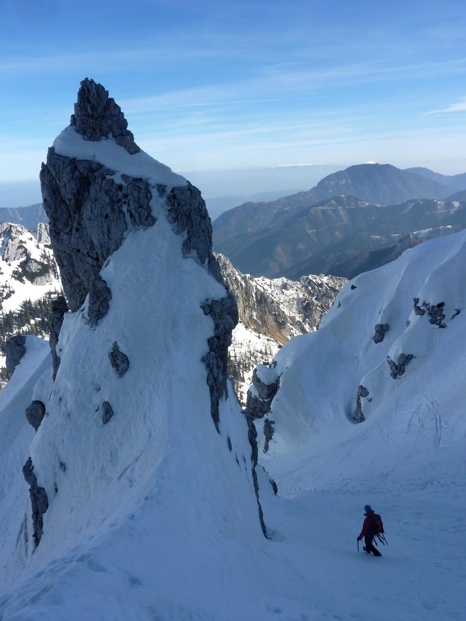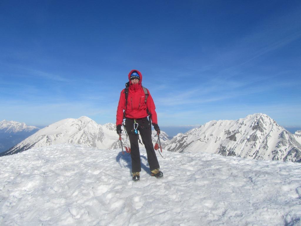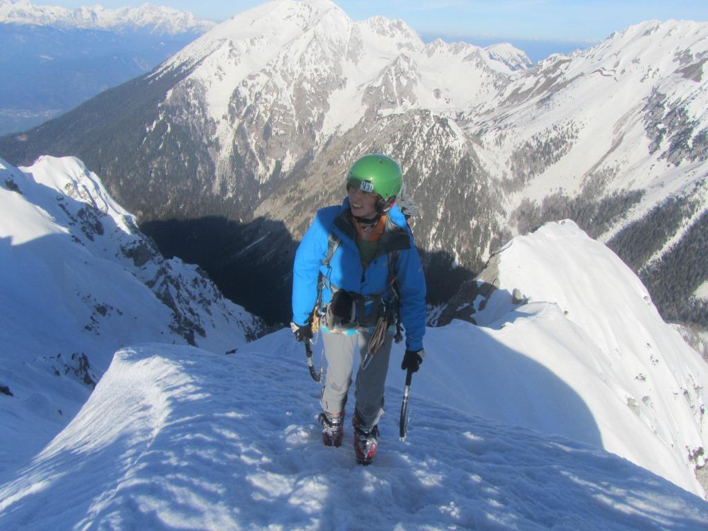 Kot po dolgih stopnicah nadaljujeva navzgor na severozahodni greben Begunjščice in po njem na vrh. Razmere so idealne, vreme pa prečudovito. Le na vrhu nekoliko piha jugovzhodni veter.