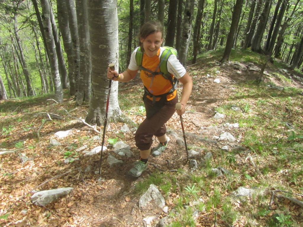 Tokrat sva se gor odpravila po najbolj običajni Mačenski poti. Sprva navkreber kreneva umirjeno. A, ne za dolgo. Na Kališče mene ni bilo mogoče zadržati. Sploh v tem toplem, skorajda poletnem, vremenu. Hočem se ustaviti, pa mi ne uspe. Trenutek kasneje se že ujamem da tečem navzgor povsem nehote. Priznam, ni mi pomoči! Na ta kraj veže me plejada cela spominov na takšen ali drugačen gorski tek. Kaja mi na srečo vztrajno in prizanesljivo sledi.