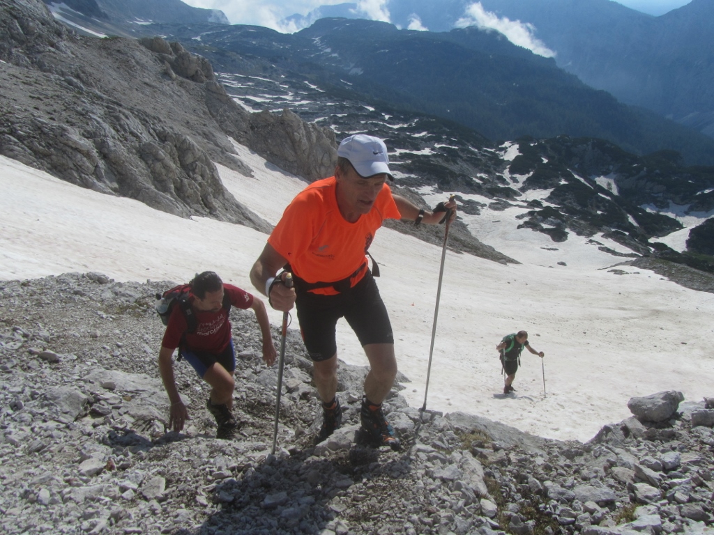 Po krajši pavzi smo se odpravili še proti Triglavu. Tudi tu so še snežišča. Vendar jih višje, kjer so jeklenice, ni. Franci se je držal zelo dobro. Pričakoval sem da bo po štirih vzponih že vsega naveličan, pa je bil ves čas polnih ust smeha. Če bi se samega podviga lotil nekoliko odločneje, bi z lahkoto zmogel v 24 urah še peti vzpon. Po dobrih 19 urah je Franci stal še četrtič pri Aljaževem domu na vrhu Triglava. Zadnjih metrov poti je celo pretekel. Sledil je le še spust v dolino. Le ta je bil precej poenostavljen, saj je zaradi številnih snežišč šlo skorajda samo od sebe. In ravno to je Franciju pomagalo, da si je pri spustih prihranil nekaj moči. Za sestop si je sicer izbral običajno letno pot s Planike proti Konjskemu sedlu. Do sem se da še presmučati.