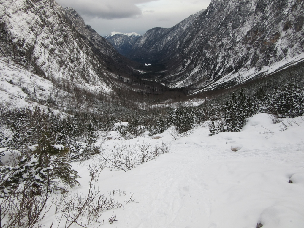 Snega v Krmi je sicer zelo malo. Na smučeh se sicer da začeti že pri avtu, a je snega premalo za vijuganje oz. za smuko po gozdu. S smučmi se da pripeljati recimo do ravnice Vrtače. Pač pa je zaradi dežja tistih dobrih 10 cm spremenjenih led, po katerem je brez derez težko hoditi. Na srečo je včeraj padlo še nekaj malega snega, ki je večinoma prekril led.