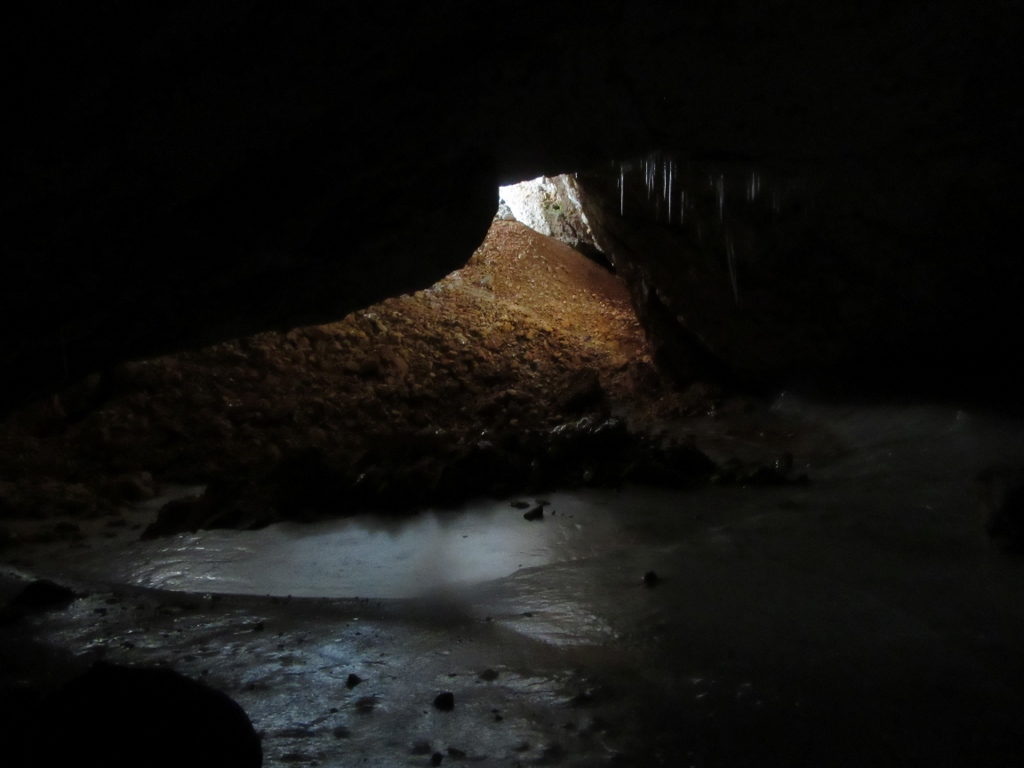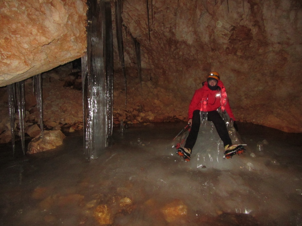 Po snežišču sva se spustila do vhoda v jamo. Tu pa naju je pričakal pravljičen svet ledenih kapnikov in pa zaledenelega jezerca. Samo jamo sestavljata dve jamski dvorani (Podorna in Snežna), ki ju veže skalni prag čez katerega je tekel zaledeneli slap – prav gotovo najvišji v Sloveniji. Na koncu spodnje dvorane, je bilo tudi večje snežišče, ki nam je dalo vedeti da tu nekje mora biti še drugi vhod v jamo. Pa ga nisva poiskala in sva se vrnila iz jame.