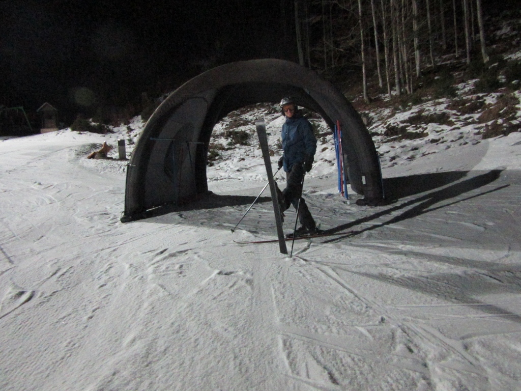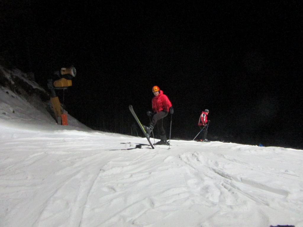 Ali imava za danes dovolj? Ne, seveda ne! Midva sva gorska tekača. In sva šla še na nočno smuko na smučišče v Kranjsko Goro. Snega na smučišču je izredno malo. Pa še tisti, ki je –  je ves umeten. Smučala sva še nedeljsko dopoldne. Tako da sva se za prvič letos kar dobro nasmučala.
