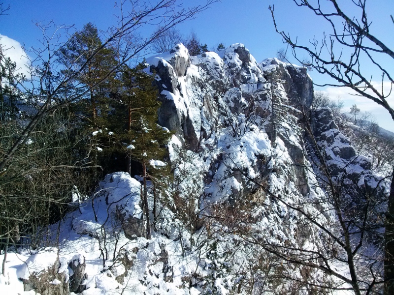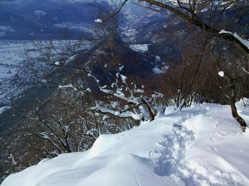 Že po kakšnih dobrih petih minutah teka, naletimo na prvi zahteven del grebena. Tu je treba malce poplezati po izpostavljenem skalovju. Mogoč pa je tudi obvoz po desni strani, ki pa tudi ni brez nevarnosti. Zato neizkušenim svetujem da se grebenu priključijo šele nad vodnim stolpom ali pri sv. Lovrencu. Danes je bil sneg za gaženje odličen, puhast. Ni bil pa dober za plezanje, saj je drselo. Zato je bila potrebna izrazita previdnost na vseh skalnatih delih, ki jih je na tej poti kar precej.