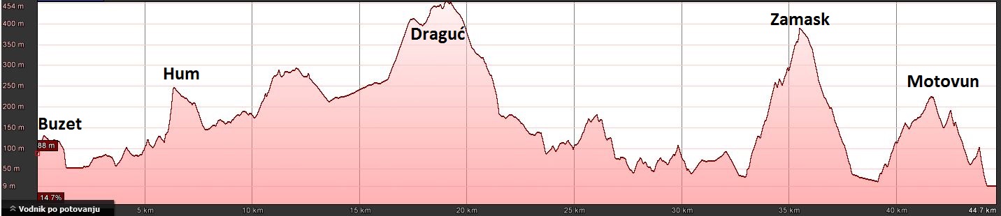 Za jezerom nas je čakalo še dobrih 300 višincev vzpona do vasi Zamask. Vzpon je bil za 100 milj Istre relativno strm. Z vrha pa je bil naš cilj – Motovun – kot na dlani. Potreben je bil le še spust povsem v dolino in nazaj gor prav na vrh Motovuna. Gre za res idilično, zelo lepo ohranjeno srednjeveško vas oz. uradno kar mesto. Vendar sem bil že preveč utrujen, da bi se mi ljubilo preveč ukvarjati s kulturo. Zelo sem bil vesel da nas je čakal le še spust do avtomobila v dolini. Na koncu se je nabralo 45 km in 1650 višincev vzpona in prav toliko tudi spusta.