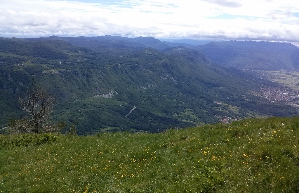Pogled s Predmeje proti Sinjemu vrhu in Javorniku (vrh v oblakih v sredini slike), kamor naju je vodila pot