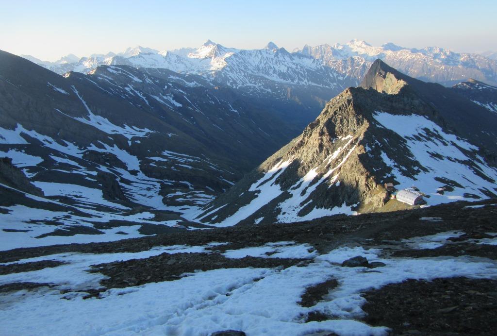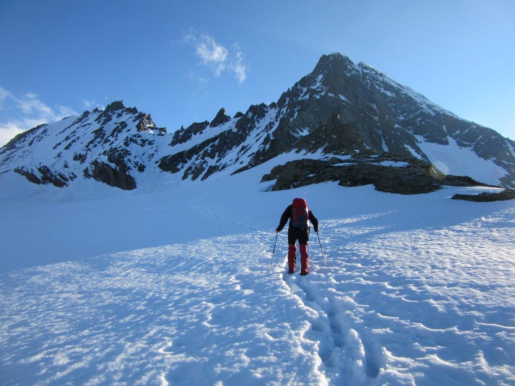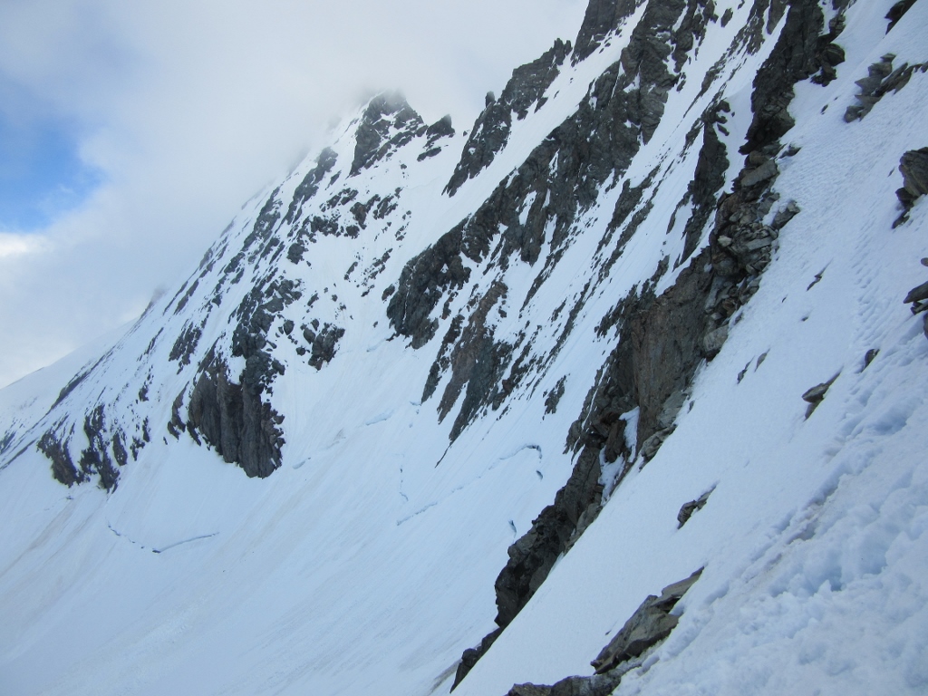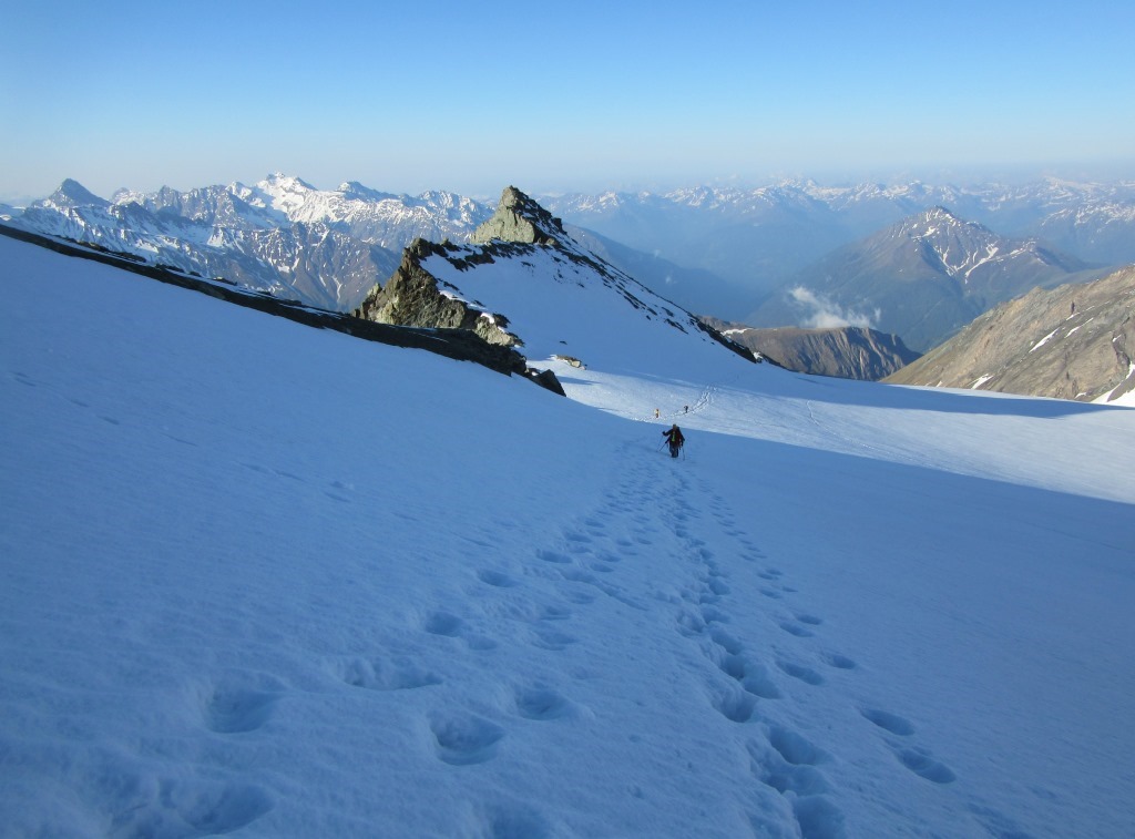 Nad kočo Locknerhütte (2241 m) se kmalu začnejo snežišča. Pot proti koči Studelhütte se jim sicer večinoma ogne. V povprečju je tu na isti nadmorski višini precej več snega kot v naših hribih. Težava je bila le v tem da so bili naši nahrbtniki opremljeni z vso alpinistično kramo in zato izredno težki. Ob tem sem presenečen in ne morem prehvaliti kondicije in vzdržljivosti kolegov iz PD Cepmin. Pri koči Studelhütte smo bili le v 1 h 45 min. Koča je zaprta. Zato so nekateri plezalci noč preživeli kar v šotorih.