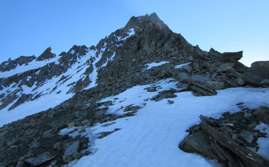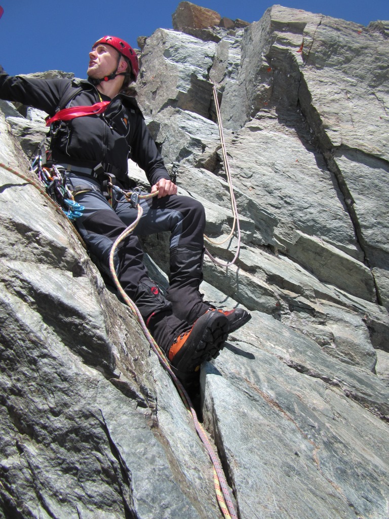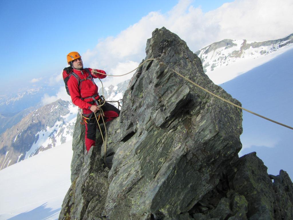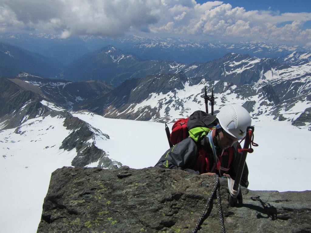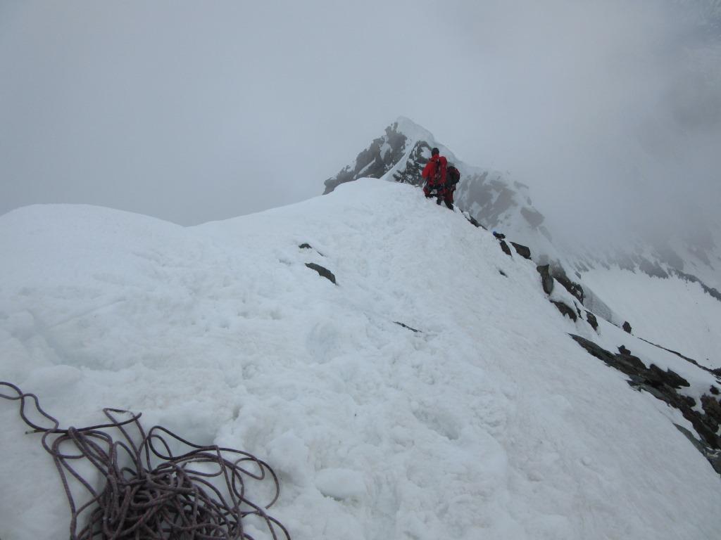 Meni je za tem začelo zmanjkovati moči. Posledično smo bili zaradi tega počasni. Vreme pa se je hitro slabšalo. V daljavi je že divjala nevihta. Ne glede na utrujenost in tudi očitne posledice višine, je bilo potrebno prestaviti v višjo prestavo. Poskusil sem plezati tako hitro kot sem le lahko, med tem ko sta me Franci in Janez varovala. Njima gre res velika zahvala da sta me varno spravila čez steno. Peter in Viktor sta bila medtem že na vrhu. Dva raztežaja pod vrhom je k nam priletel reševalni helikopter. Odmahnili smo da ne potrebujemo pomoči. Pomoč sta potrebovala avstrijska plezalca, ki sta plezala cel dan tik za nami. Tik pod vrhom je sledilo še nekaj prečenja po strmih južnih snežiščih.