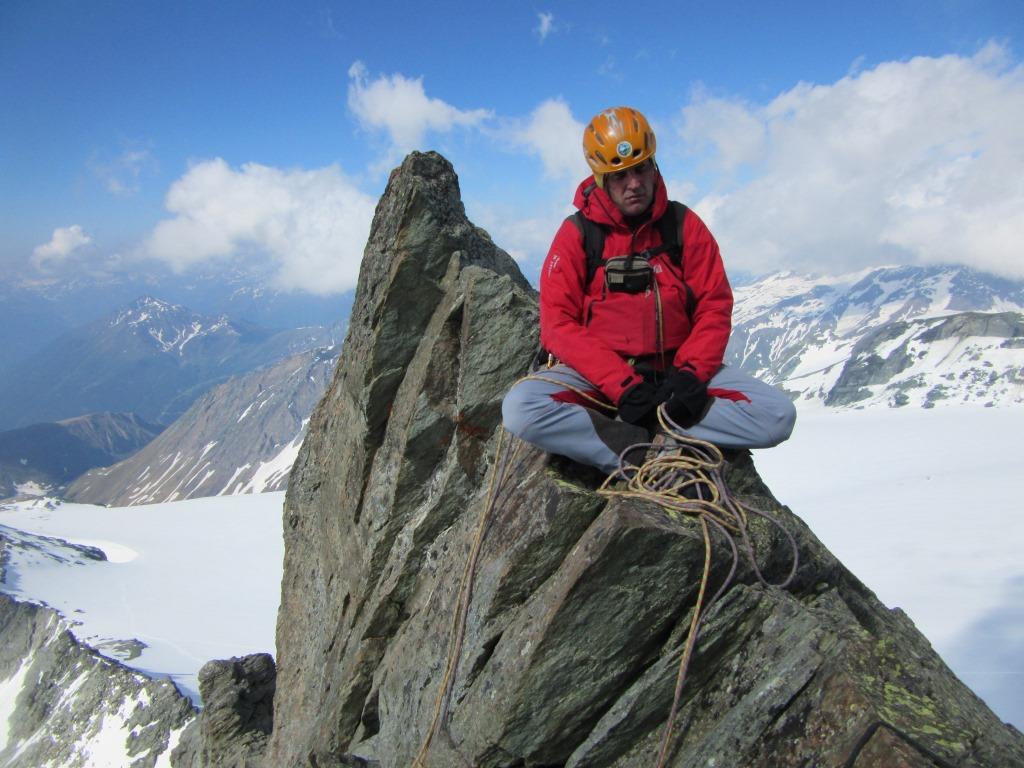 Na vrhu Grossglocknerja ni bilo časa za veselje ob premagani smeri. Prej obratno. Zaradi pripravljajoče se nevihte, je bilo potrebno sestopiti takoj! Zaradi elektrike v zraku je križ na vrhu kar brnel. Niti slikali se nismo na vrhu. Samo nataknili smo dereze in takoj začeli s sestopom po klasični poti na Grossglockner. Pot sem dobro poznal, saj sva tu s Petrom priplezala na Grossglockner dve leti nazaj. Edini zahteven del je prav sestop z vrha v škrbino Glocknerscharte. Vendar v resnici nič posebnega.