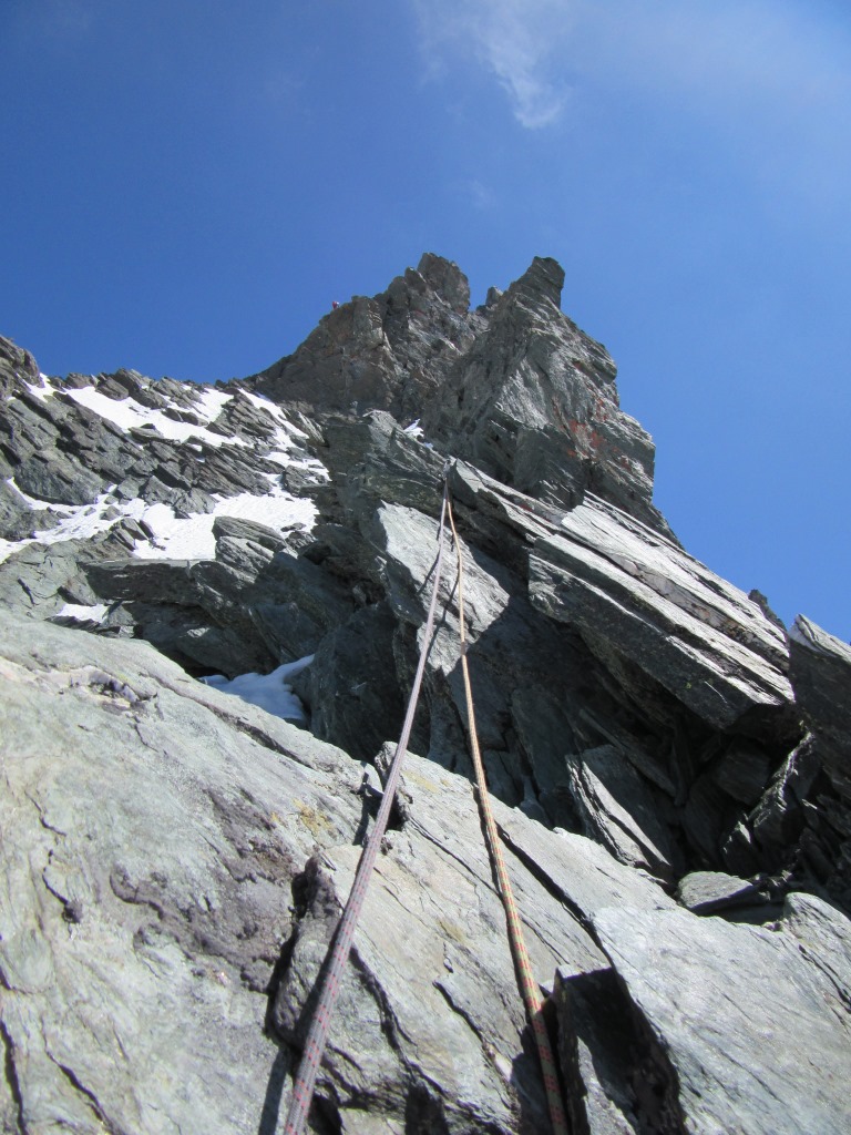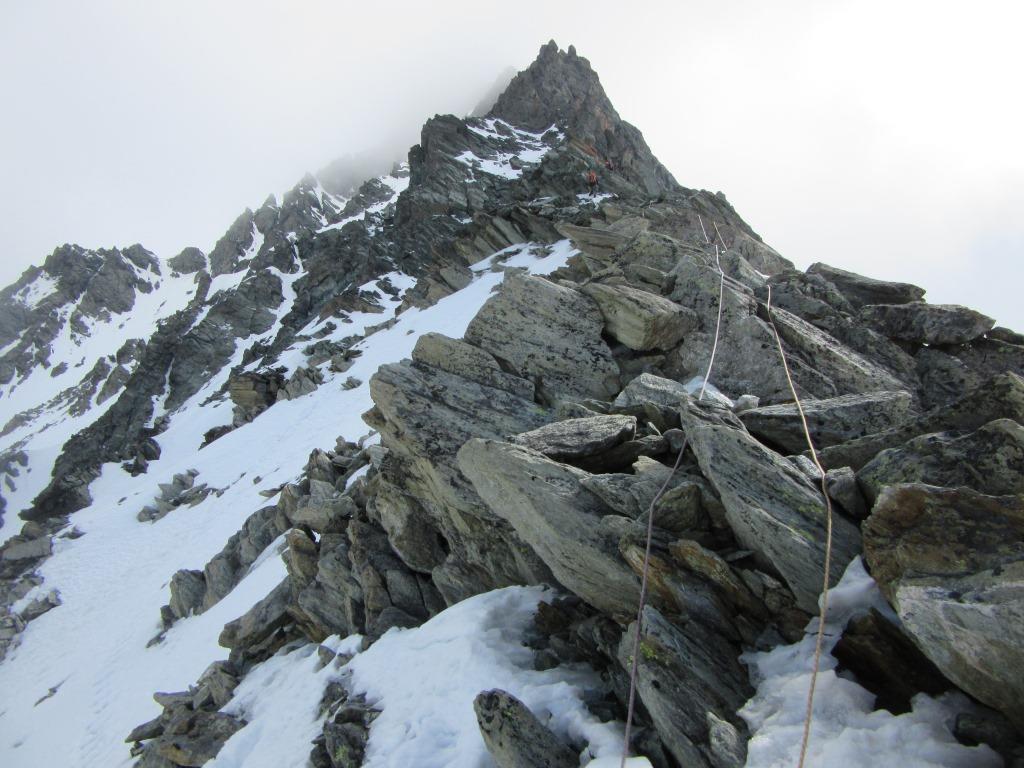 Razporedili smo se v dve navezi. Peter in Viktor sta plezala sama. Sam pa sem bil v navezi treh s Janezom in Francijem. Že prvi raztežaj je razmeroma težak in poteka prek izpostavljenih skalnih plošč (III). Potem pa kar nekaj časa (ca. 5 raztežajev) sledi lažje plezanje po bolj položnem in manj izpostavljenem delu grebena. Naveza Peter / Viktor je bila hitrejša od nas treh in nam je pobegnila za kak raztežaj naprej. Varovali smo se vse raztežaje. gneče na grebenu skorajda ni bilo. Cel dan smo plezali skupaj le z neko Avstrijsko navezo.