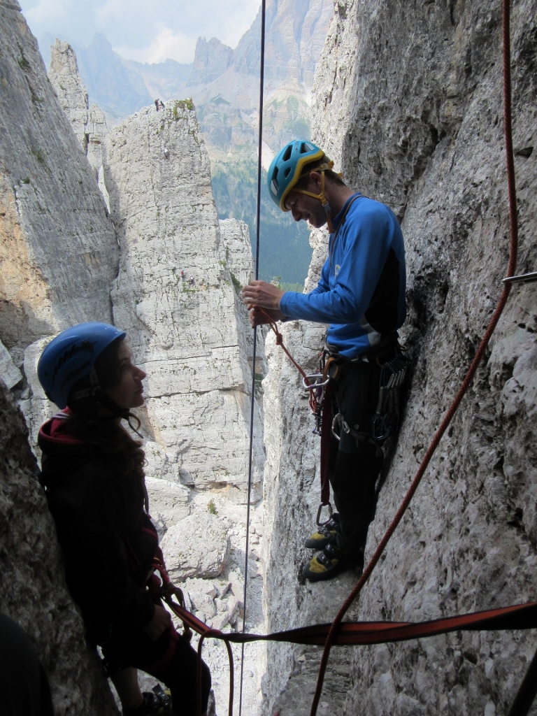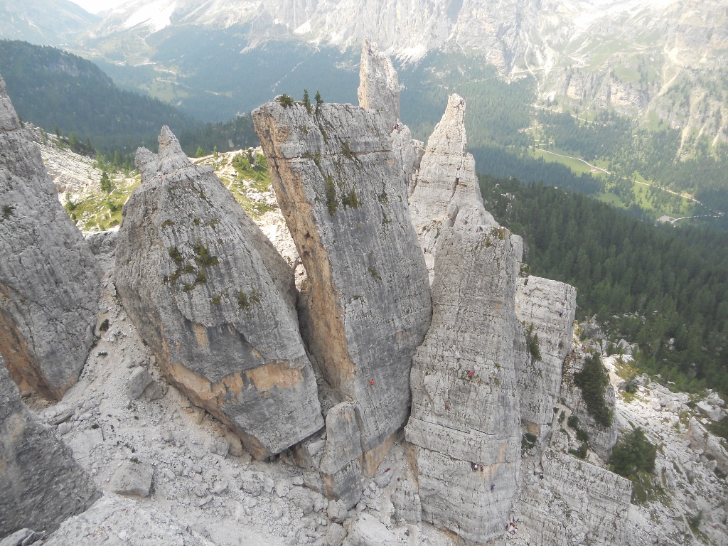 Ravni vrhovi stolpov so kot nalašč za samotno sončenje pod oblaki. Vmes pa smo lahko uživali v čudovitih razgledih na Tofane, Lagazuoi in druge vrhove. S stolpa smo sestopili s pomočjo spustov po vrvi. Dvojna vrv (2 x 60 m) je tu v zelo veliko pomoč.