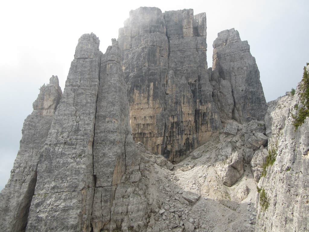 Prvi dan smo se odpravili proti skupini skalnih stolpov z imenom Cinque Torre. Stolpov v resnici ni samo pet, ampak jih je okrog deset. Kot da jih je pet, izgleda iz ceste na prelaz Falzarego. Skorajda do njihovega vznožja z ene strani vodi cesta, z druge strani pa žičnica. Zato je dostop (z vso težko plezalno kramo) udoben in zelo kratek.