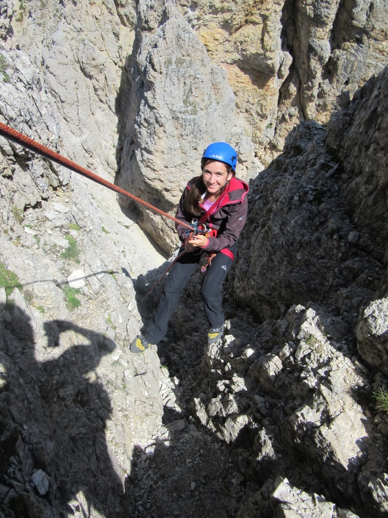 Po formalnosti na vrhu (nekdo je bil prvič nad 3000 m in zato ustrezno krščen), smo hitro začeli s sestopom. Sestopili smo na severovzhod proti koči Giussani (2580 m), ki leži na sedlu med Tofano di Rozes in Tofano di Mezza. Sama pot je vse prej kot prijetna, saj ves čas poteka po potkah in skalah posutih z drobirjem, kjer je zelo nevarno za zdrs. Ponekod je treba tudi malce popelezati. Na najtežjem delu je urejen abzajl.