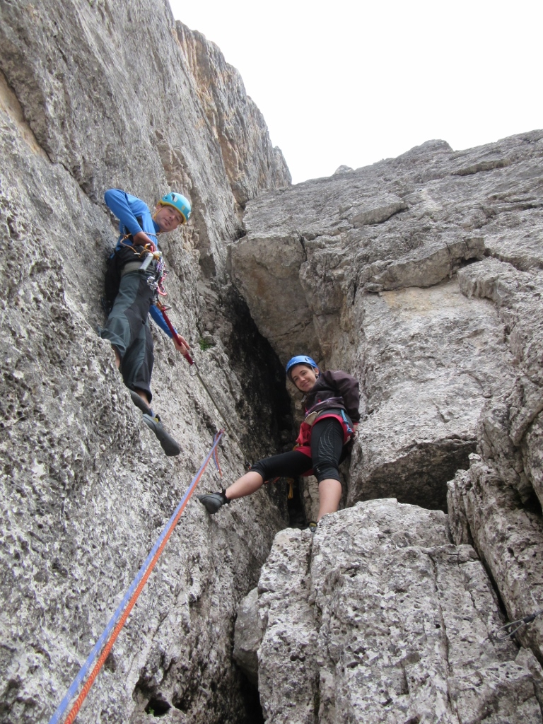 Zadnji dan smo šli spet zares plezat. Tokrat v skalne stolpe severno od prelaza Flazarego, v bližini gore Col de Bois. Splezali smo smer v Grosser Falzaregturmu. Smer z izjemo sidrišč ni bila navratana. Je pa ponujala nepretežko in skorajda prvinsko plezanje. Po nevihti oprano nebo, pa je ponujalo razglede po vršacih v daljavo vse do pogorja Piz Boe.