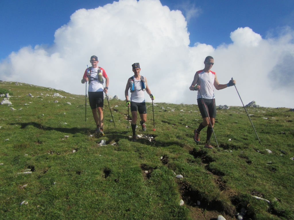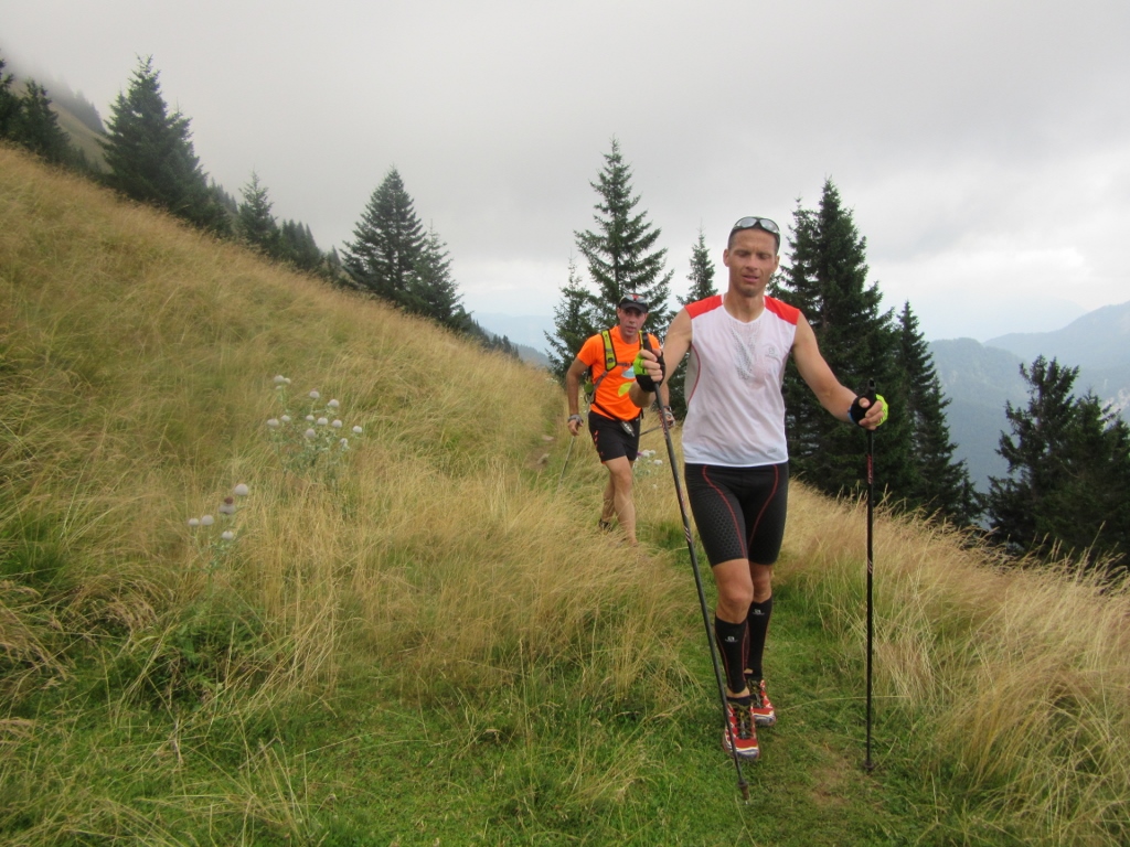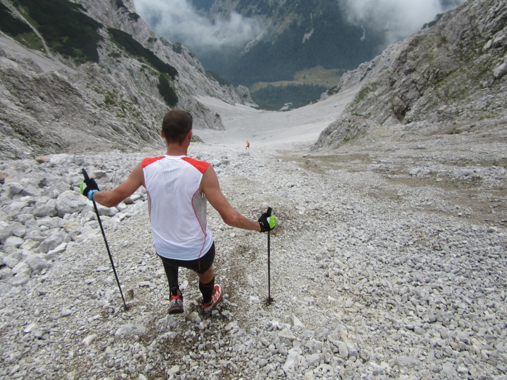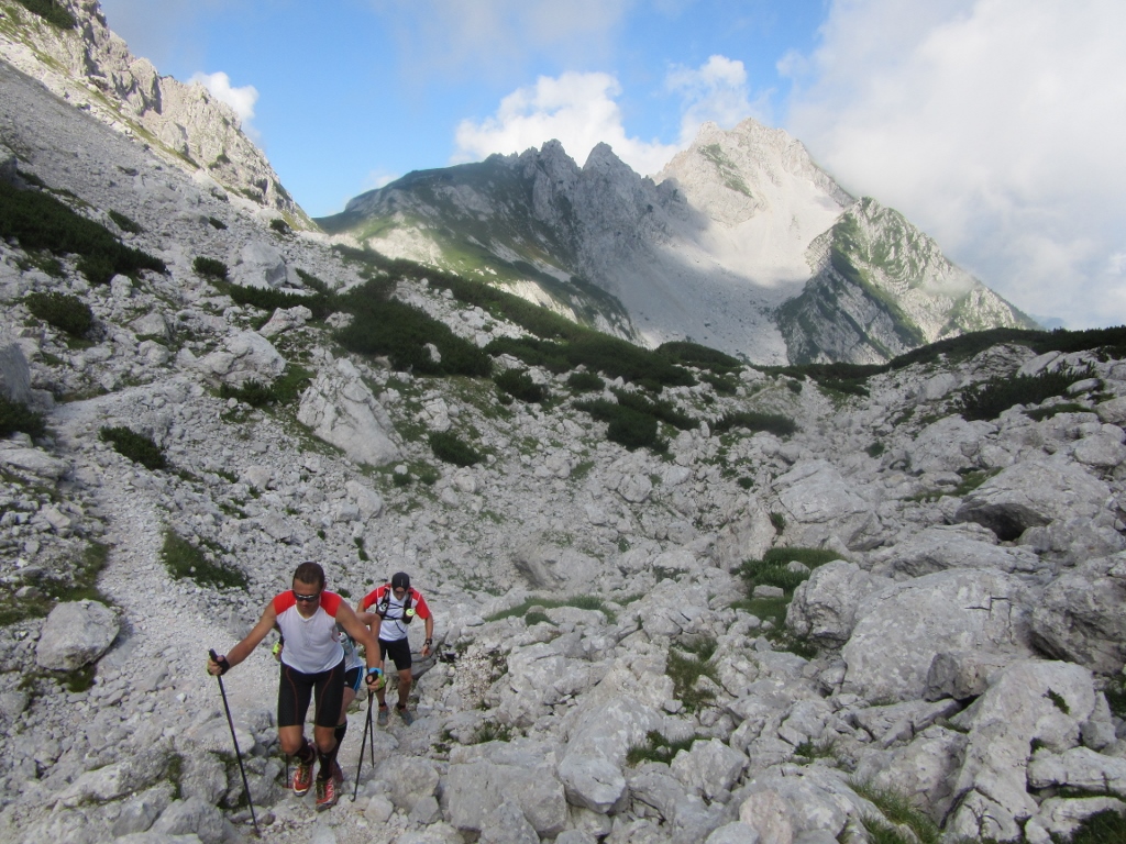 Tako smo potem skupaj zagrizli proti Robleku. Pot je tu lepa. Zato smo vsaj ravnine lahko tekli. Na Robleku smo se ustavili samo minuto za žigosanje. Na poti proti vrhu Begunjščice se je navlekla megla, ki nas je prijetno hladila. Vendar megle ni bilo na severni strani gore. Zato smo se odločili da sestopimo po Smokuškem plazu in potem naprej po markirani poti. To se je izkazalo za napako, saj se je markirana pot zelo vlekla in smo izgubili kakšnih 10 minut časa v primerjavi s običajnim sestopom po Šentanskem plazu.