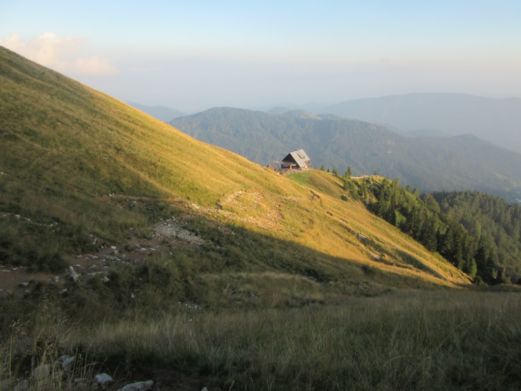 Za tem smo mimo Goče na Golici nadaljevali na vrh Golice. Tu je spet Klemen tako močno potegnil, da ga je bilo komajda mogoče slediti. Golica je sicer čudovita gora. A, lepega je bilo za nas tu konec. Pravzaprav se je etapa tu šele začela za res. Spust iz Golice poteka po izredno ozki skalnati stezici sredi visoke trave. Klemen si je mesec dni pred podvigom na Skuti zelo hudo zvil gleženj. Zato tokrat nisem bil edini, ki je trepetal na vsakem koraku tu navzdol. Na koncu spusta smo za nagrado doživeli čudovit travniški sončni zahod. Joj, ko se nam le ne bi tako mudilo naprej, bi lahko nastalo res nekaj čudovitih posnetkov. Pa drugič.
