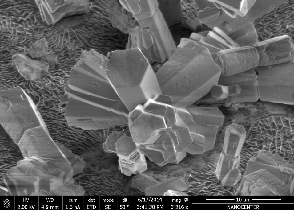 FIB je v osnovi zelo močan mikroskop, ki ga lahko uporabljam tudi za klasično fotografiranje vzorcev – v tem primeru heksagonalnih kristalov cinkovega oksida