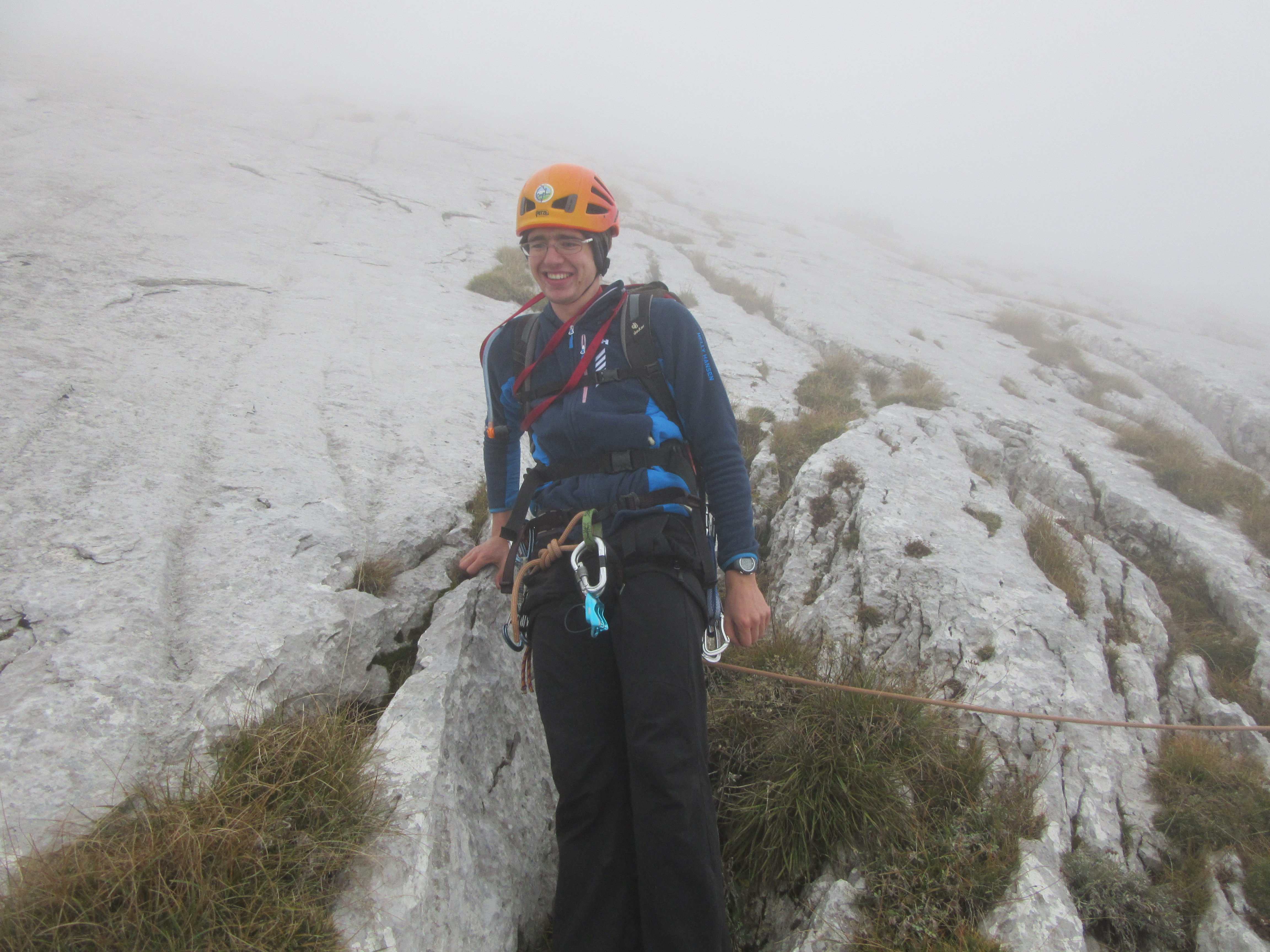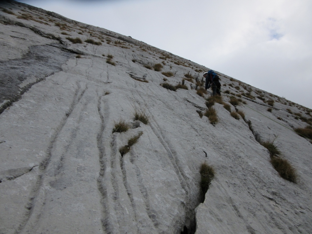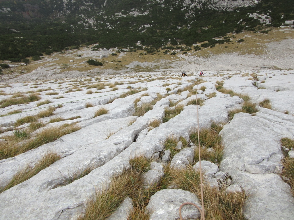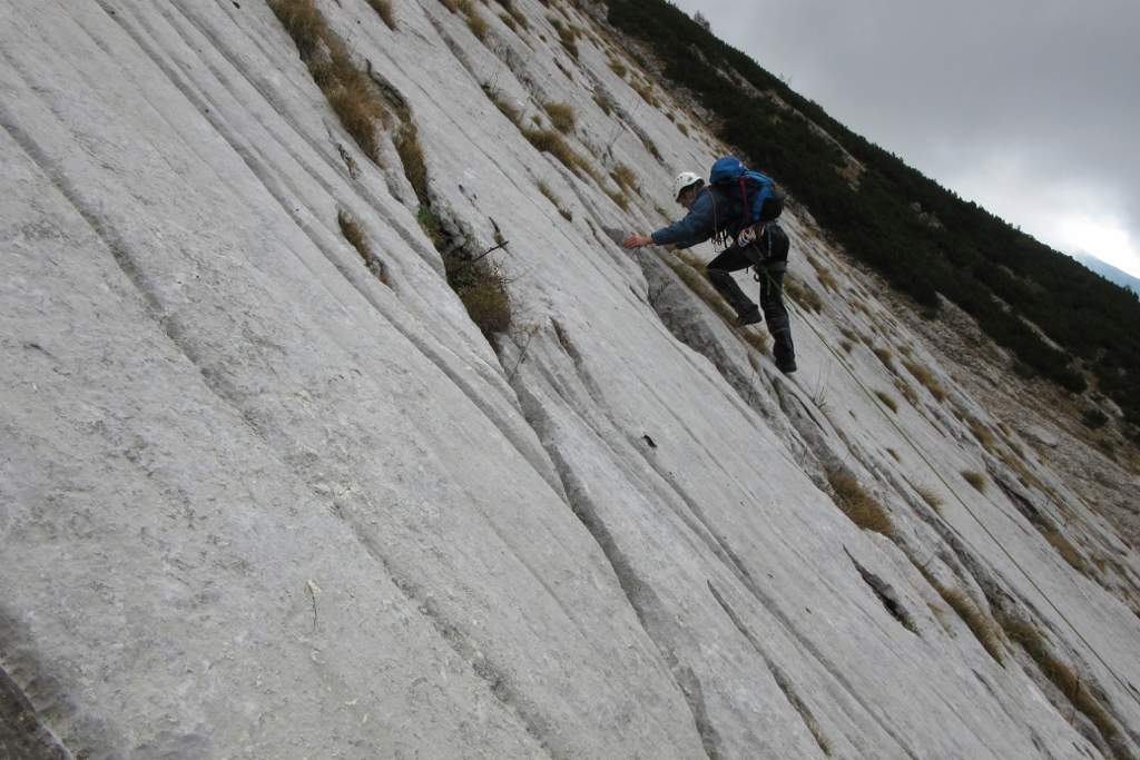 V prvem raztežaju sem se kar malo lovil, ker se je bilo potrebno navaditi na plezanje na trenje. “Goljufanje” s stopanjem na šope trave ali mahu, se ni obrestovalo, saj so se plezalke umazale s prstjo, kar jih je naredilo spolzke. Drugi raztežaj je lažji in bolj razčlenjen ter pripelje na desno stran odloma, ki se ga lepo vidi od spodaj. Do tu nas je še grelo sonce.