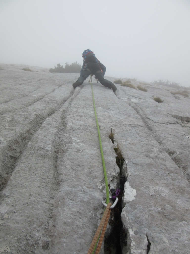 Potem pa sta se na vlekla mraz in megla. Posledično sem v tretjem raztežaju nekoliko zgrešil smer. Ker je zmanjkalo vrvi, sem bil primoran izdelati varovališče na večjem skalnem ušesu. Le teh je v Škrbinski plošči res precej. Četrti raztežaj končno pokaže “petico” dolgo obljubljeno v oceni. Tu se pleza po gladki plošči, kjer ni drugih razčlemb, kot dveh za en prst globokih žlebičev, po katerih nekaj 10 m plezamo po kaminsko z nogama globoko v razkoraku. Res, super adrenalinsko!