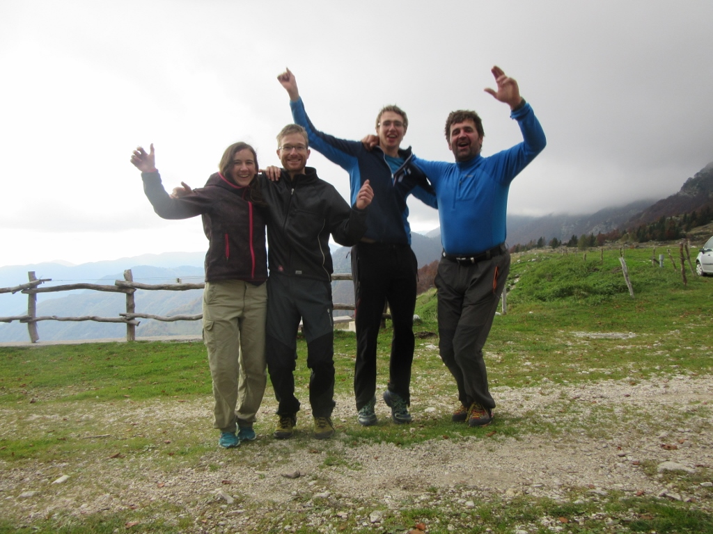 Zadnji raztežaj brez večjih težav pripelje na vrh smeri. S tod pa nadaljujem levo po robu plošče na greben. Le ta pa nas po 20 min hoje pripelje na markirano pot, ki s planine Razor pelje na Vrh nad Škrbino. Mi smo vrh spustili, ker se nam je žal mudilo v dolino. Bi nas pa na vrhu gotovo pričakalo nekaj malega gaženja po svežem snegu.