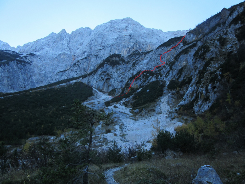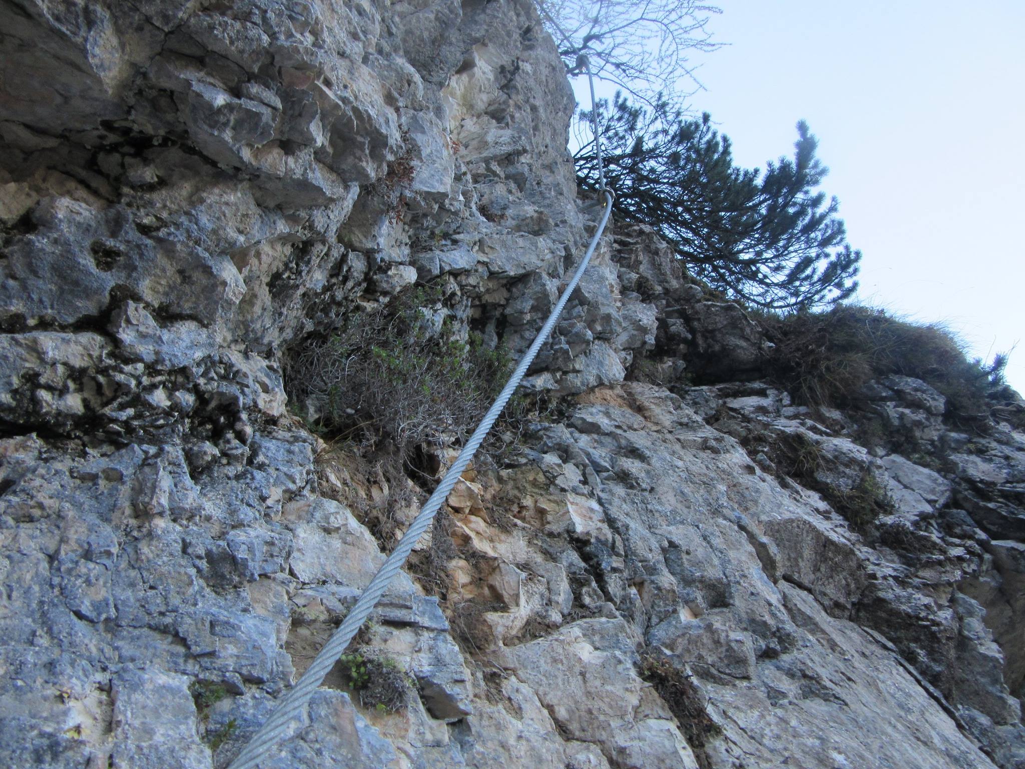 Začetek ferate že takoj spada med njene najtežje odseke. Tudi ta ferata sodi med strogo športne ferate. Zato skob tukaj ni. Vendar je teren tu precej razčlenjen. Zaradi česar je precej prostora za noge. Po drugi strani je skala krušljiva, vmes pa je tudi precej zemlje in blata. Zato menim da bi bili tu plezalni čevlji bolj v oviro, kot v korist.