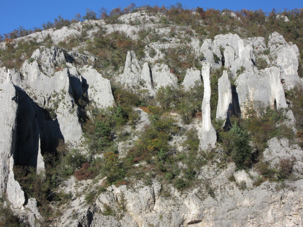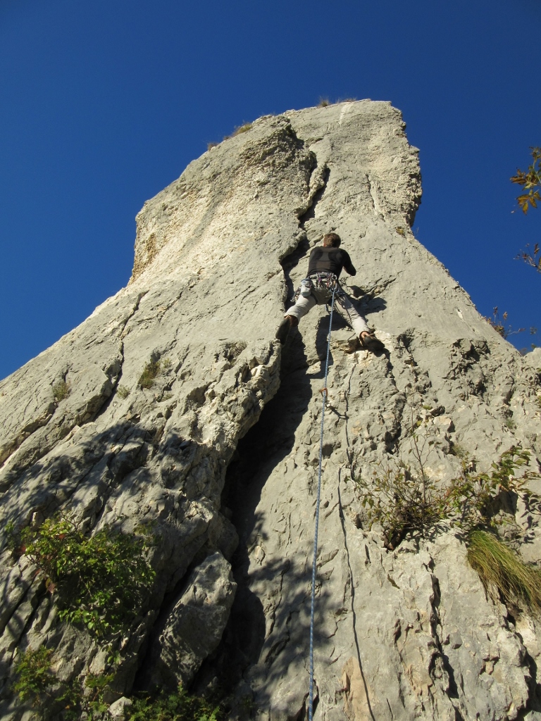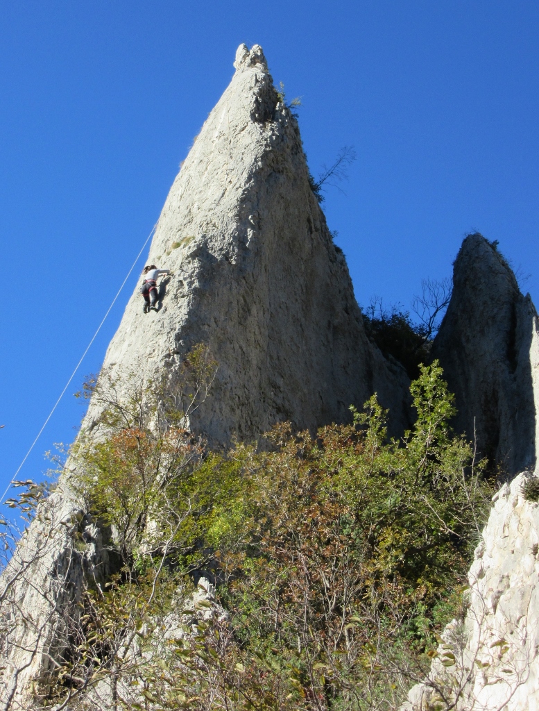 Plezališče je razdeljeno na približno 10 sektorjev, od katerih so samo trije s po več smermi. Prevladujejo smeri težje od 6a. Približno deset smeri pa je tudi lažjih. Po začetnem ogrevanju, sva napadla smer Comici brid (raz) v Velikem toranju. Smer ime seveda po največjem plezalcu med obema vojnama – Emiliu Comiciju. Ocena 6a iz plezalnega vodnika verjetno ni na mestu. Vseeno pa smer kar nekako presneti s svojo težavnostjo. Zaključi se v krajšem kaminu, od koder je še kakšnih 10 m lažjega plezanja do vrha stolpa.