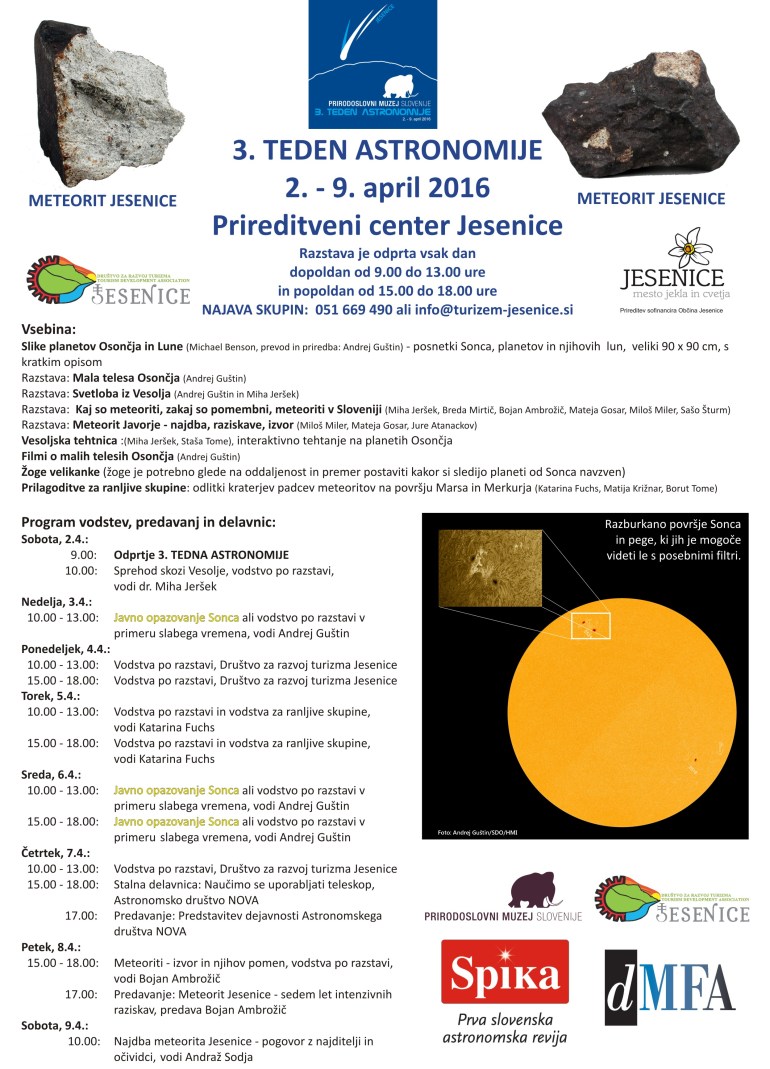 Tako bo na ogled tudi razstava o meteoritu Jesenice. Po tej razstavi vas bom popeljal tudi jaz: in sicer – v petek, 8. aprila med 15.00 in 17.00 uro. Ob 17.uri pa bom imel predavanje z naslovom: “Sedem let raziskav meteorita Jesenice“. Na predavanju bom predstavil celotno zgodbo raziskav meteorita: od začetkov, pa vse do najnovejših in najbolj naprednih raziskav, ki smo jih opravili pred kratkim. Zelo vesel bom vaših vprašanj.