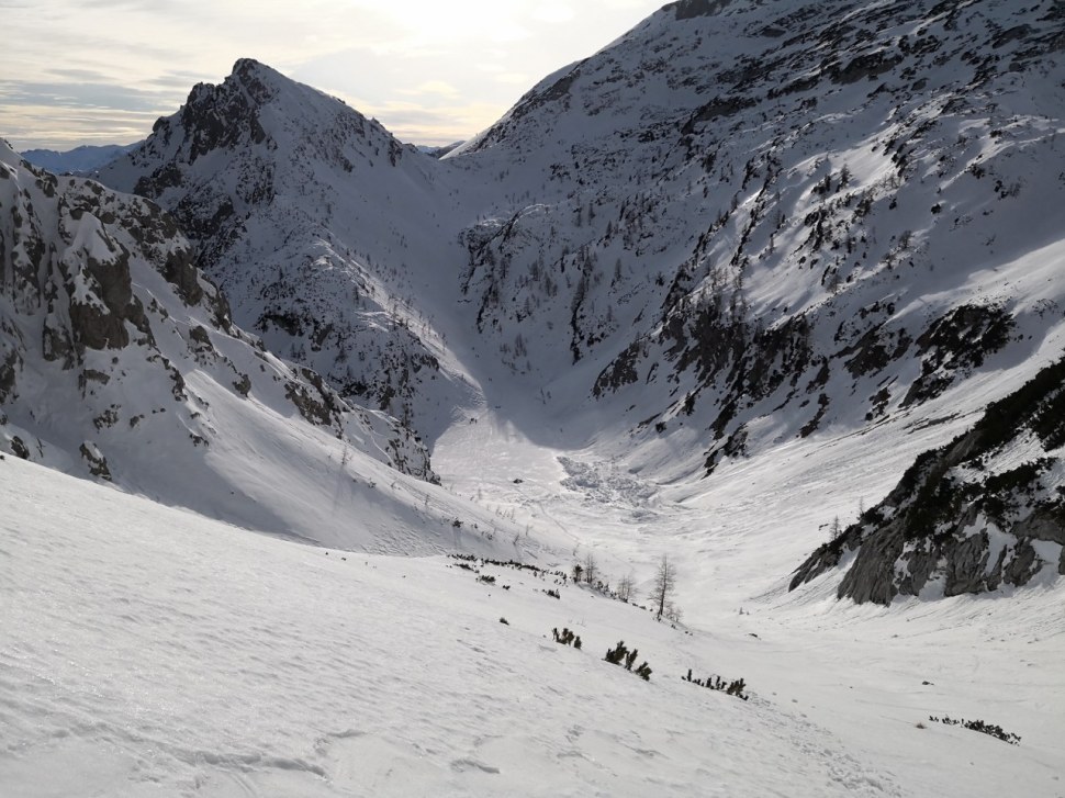 Z Ablance sem sestopil na Studorski preval (1890 m). Sestop poteka po grebenu gore in ga trenutno prekinja krajši skalni skok, ki ga je treba potulati. S Studorskega prevala sem sestopil še naprej kakšnih 50 višincev. Nato pa sem zavil desno proti krnici Vrtačici med Velikimi Draškim vrhom (VDV) in Toscem. Moj cilj je bilo preplezati Vzhodno grapo v Toscu (III, 250 m). Vendar, ker sem videl kako dobre so razmere na VDV-ju, sem sklenil, da skočim na hitro še na njega. Na vrhu VDV-ja (2240 m) me je pričakal čudovit razgled, celo veter je končno rahlo pojenjal in mi dal novo motivacijo za nadaljevanje te dolge ture. Smuka nazaj navzdol do vstopa v Vzhodno grapo je bila odlična (srenjec).