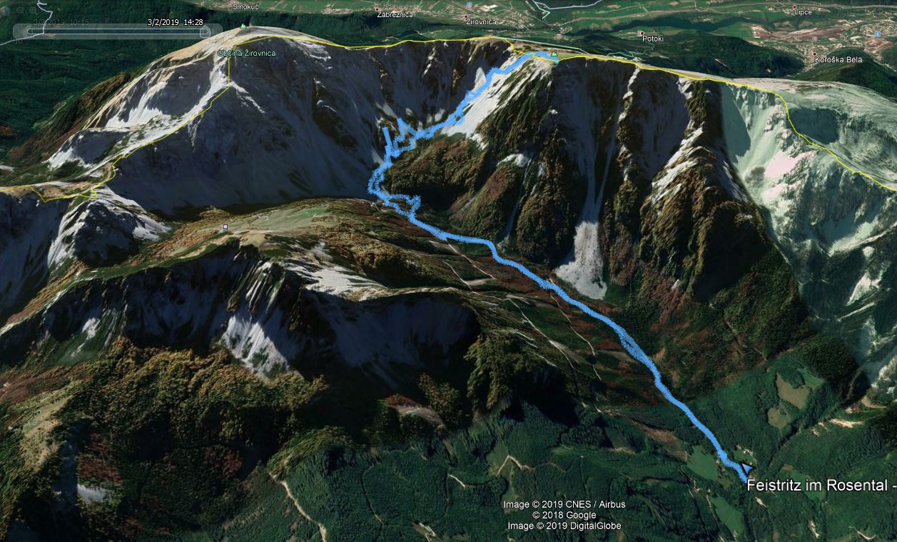 Od parkirišča sva morala iti peš samo 300 m preden se je začel sneg. Prve 3,5 km sva hodila po zaledeneli cesti, ki pelje proti Villacher hütte. Nato pa sva zavila desno na zasnežena pobočja (melišča) Vajneža in Potoškega Stola. Zadnjih 200 višincev do grebena sva hodila s smučmi na nahrbtniku, saj je tern postal strm, sneg pa trd. Za tem pa je sledilo še dobrih 5 min sprehoda po deloma kopnem travnatem pobočju do vrha Vajneža.