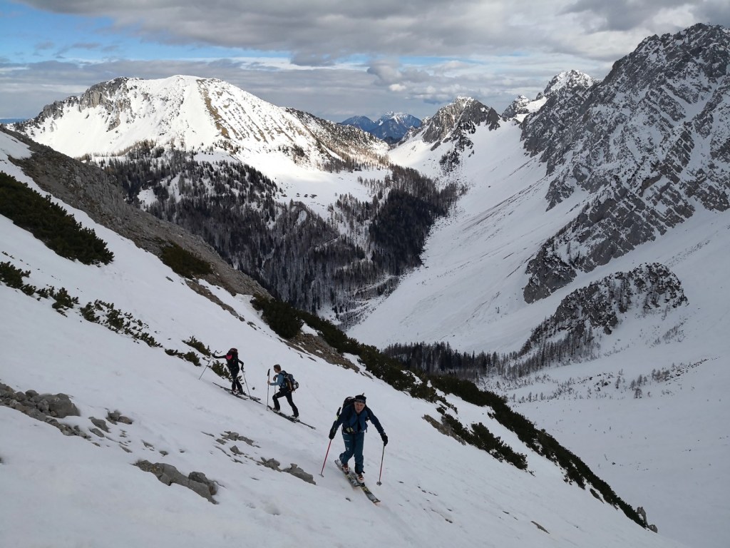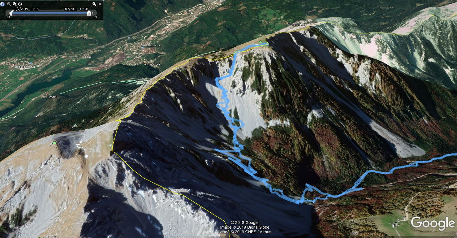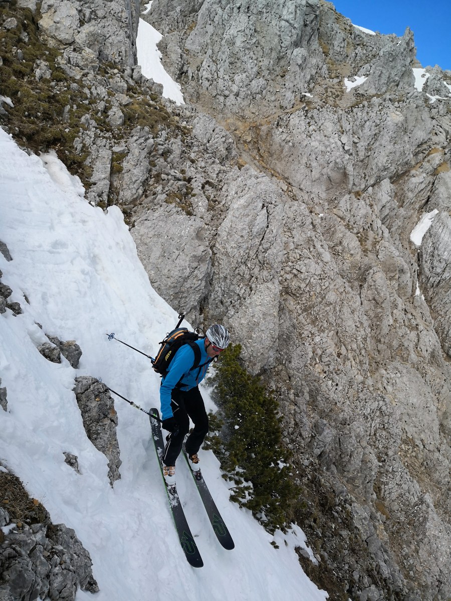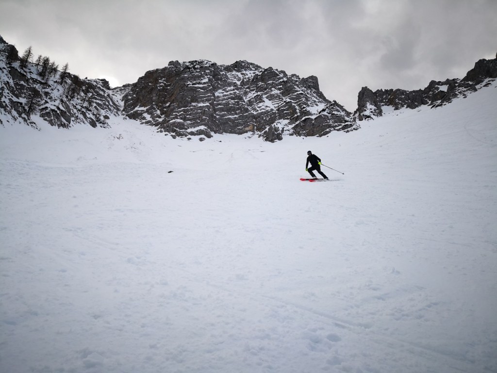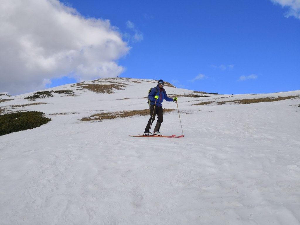 Smučala sva po smeri pristopa. Vršnih 50 višincev sva abručala, ker je bilo ledeno in strmo. Potem pa je sneg postal vse mehkejši. Smuka ni bila slaba. Nisva pa tudi bila deležna kakšnih hudih smučarskih užitkov. Pomembno nama je bilo, da sva se prismučala skorajda nazaj do avta. Za pešce priporočam uporabo derezic, za hojo po poledeneli cesti.