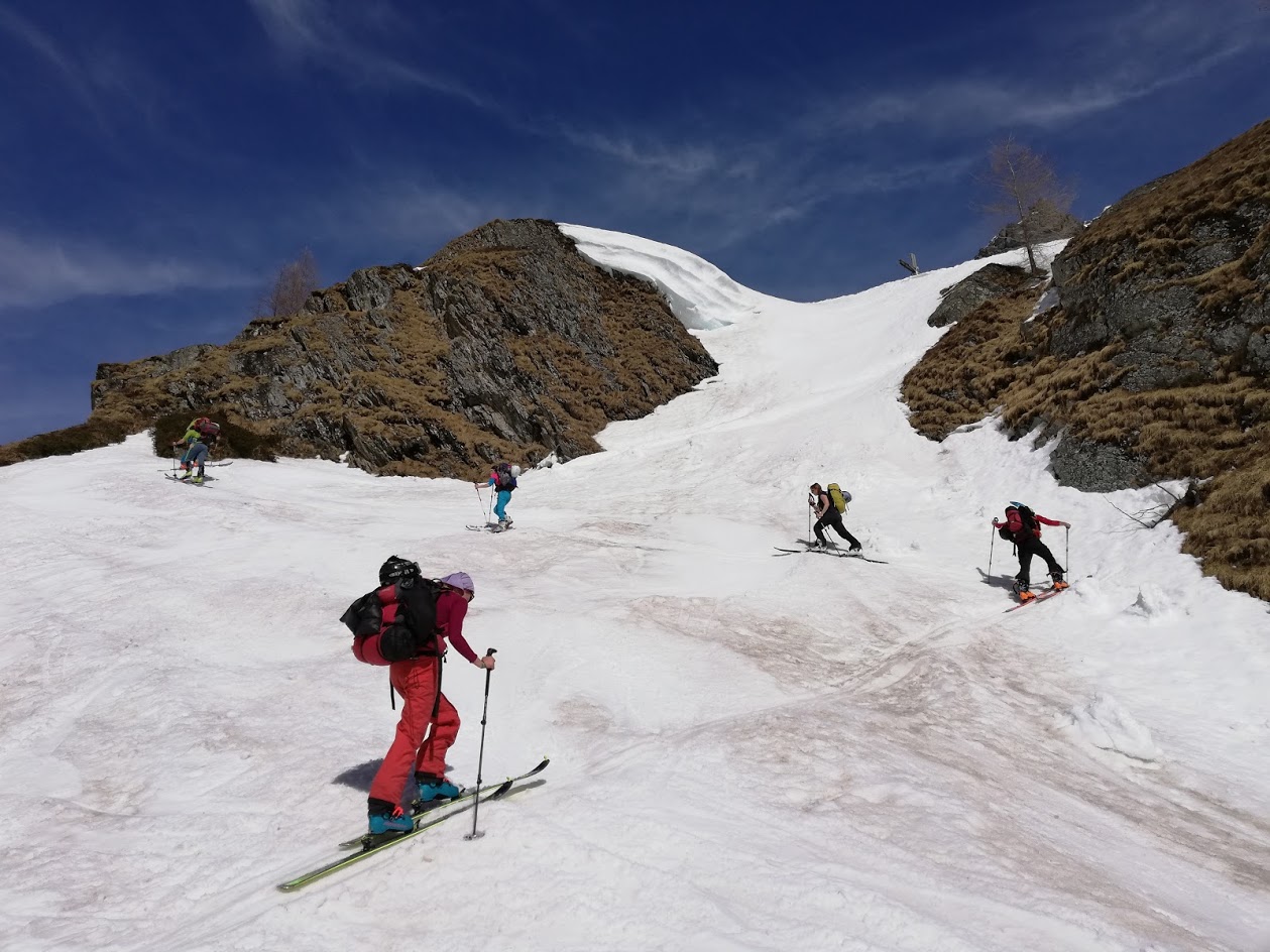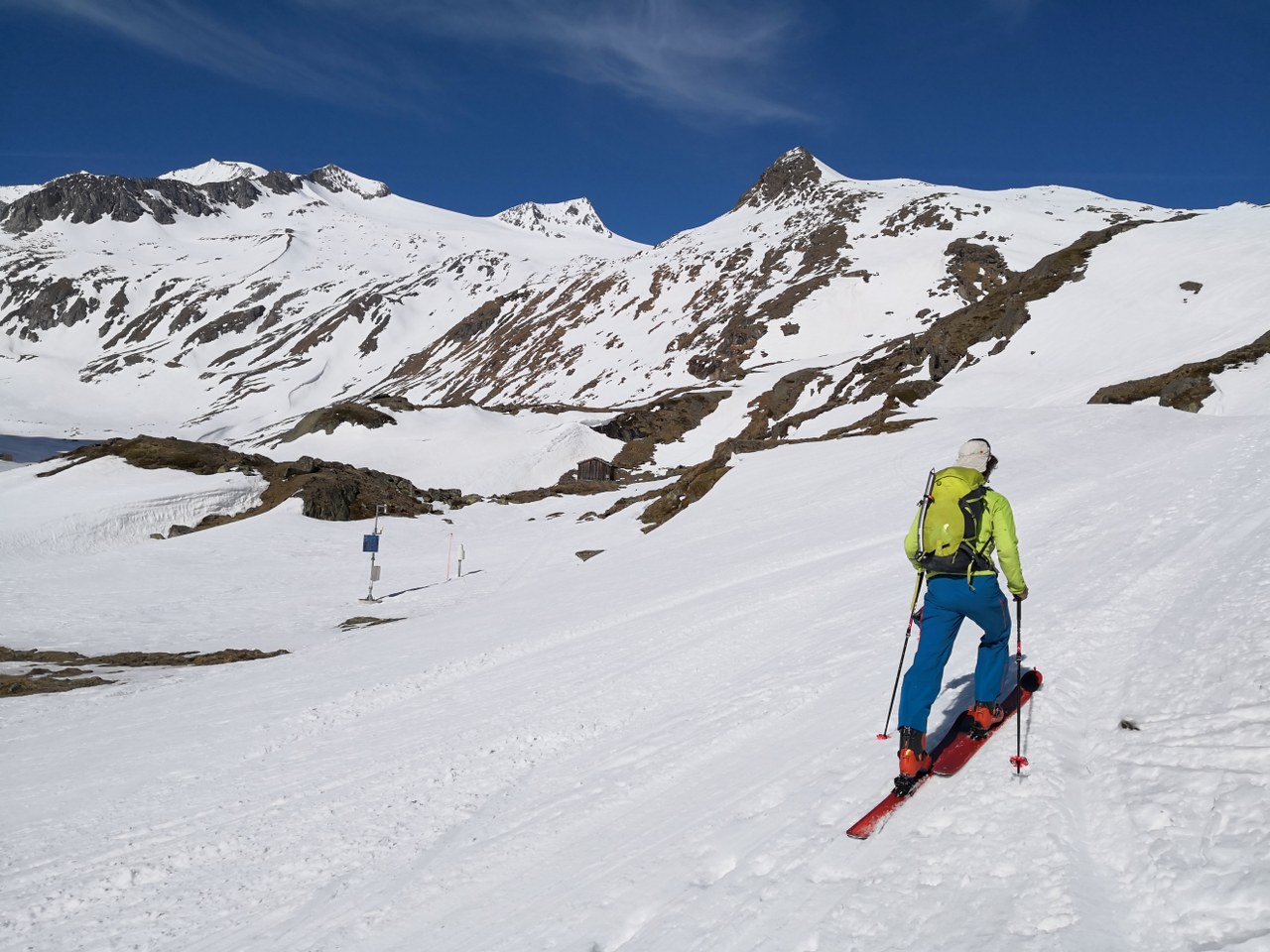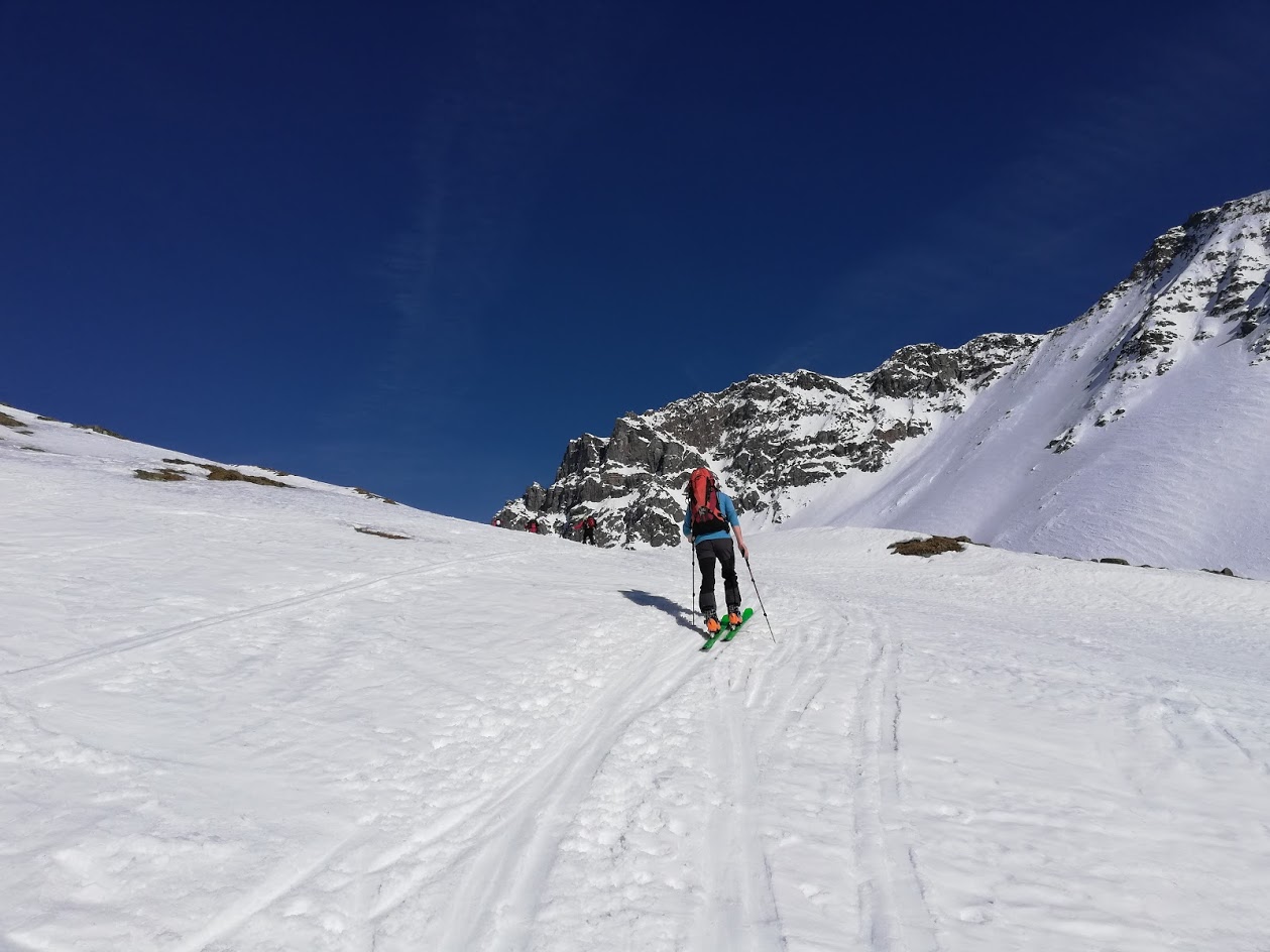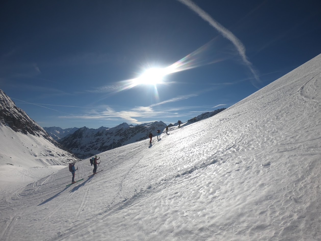 Z nabito polnega parkirišča nad Hitnerbichlom smo začeli hoditi v soboto ob 12.uri. Bilo je čudovito vreme s temperaturami okrog 20 °C. Kljub vsemu se da na smuči stopiti že na parkirišču. Z izjemo treh krajših mest (plazovine umazanega snega) se do koče Johannishütte (2121 m) hodi ves čas po snegu. Strnjena snežna odeja pa se začne šele pri velikem križu na prehodu v dolino Dorfertal. Po trasi letne poti smo se vzpeli do koče Defreggerhaus (2963 m). Koča je trenutno odprta samo ob lepih vikendih. Zato je bolj zasilno oskrbovana. Nudili so nam skupna ležišča ter skromno večerjo in zajtrk (27 €). Mene to ni niti toliko motilo. Pač pa me je (ker sem zelo zmrznjen), da bo ponoči v koči zelo hladno. Zato sem s seboj tovoril puhasto spalko, vetrne hlače in puhovko za minus 20 °C. Posledično mi je bilo celo noč zelo prijetno toplo.